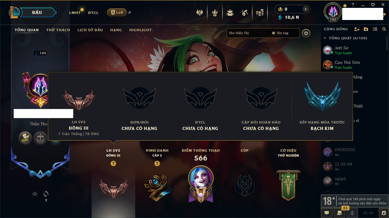 Rank Đơn: Bạch Kim IIIKhung: ĐồngTướng: 131 - Còn 3780 THXTrang Phục: 53Rank ĐTCL: Chưa RankLinh Thú: 4