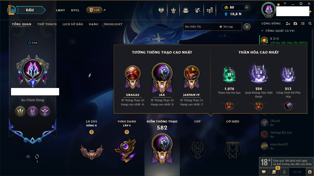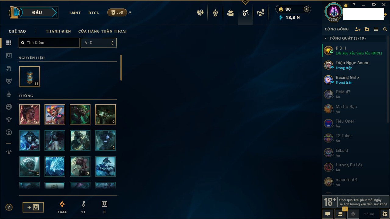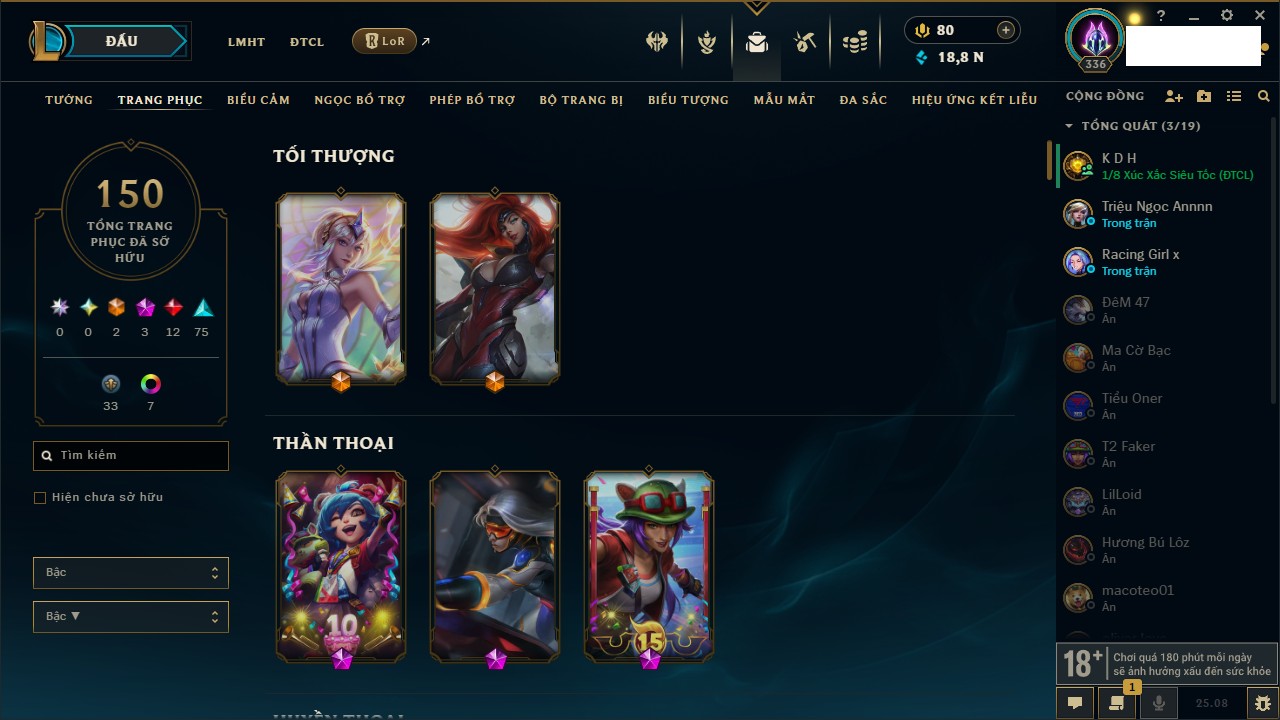 Rank Đơn: Chưa Rank Khung: Vàng Tướng: 171 - Còn 159339 THX Trang Phục: 218 Rank ĐTCL: Chưa Rank Linh Thú: 151