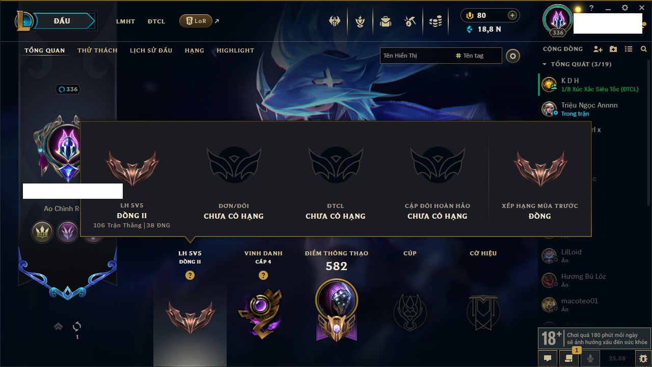 Rank Đơn: Chưa Rank Khung: Vàng Tướng: 126 - Còn 23055 THX Trang Phục: 114 Rank ĐTCL: Chưa Rank Linh Thú: 21