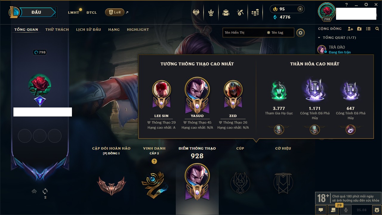 Rank Đơn: Chưa RankKhung: Chưa có khungTướng: 165 - Còn 3239 THXTrang Phục: 1372Rank ĐTCL: Chưa RankLinh Thú: 337