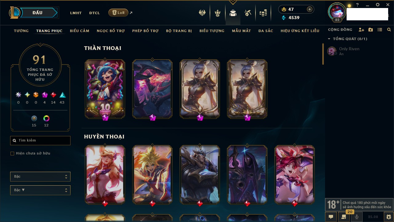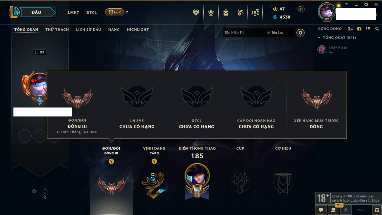 Rank Đơn: Vàng IVKhung: VàngTướng: 146 - Còn 89110 THXTrang Phục: 63Rank ĐTCL: Vàng IIILinh Thú: 41