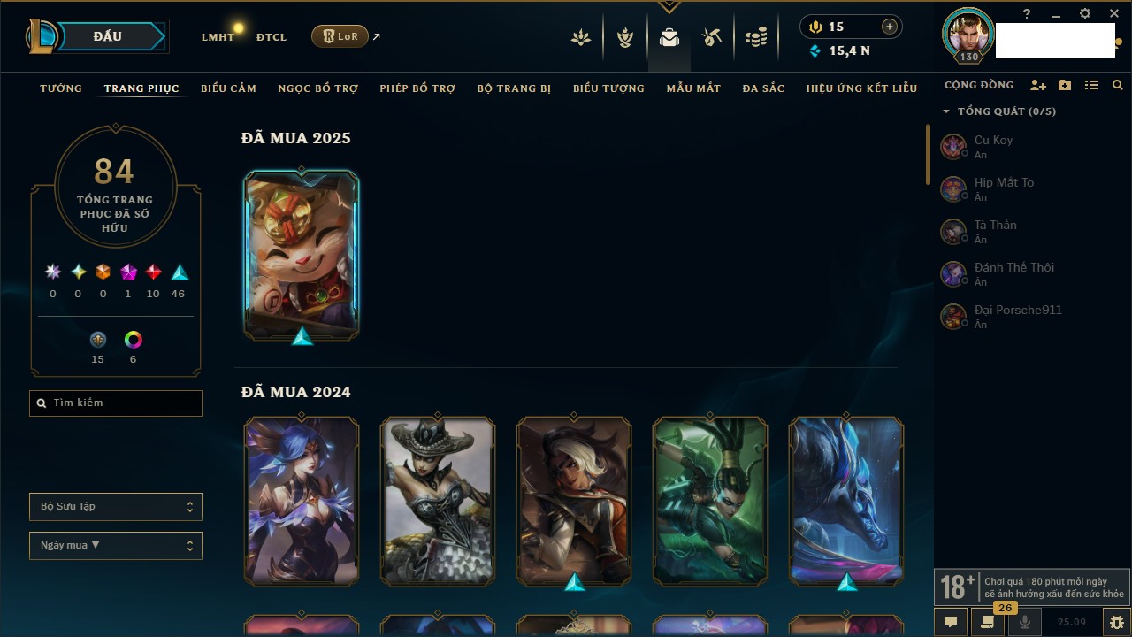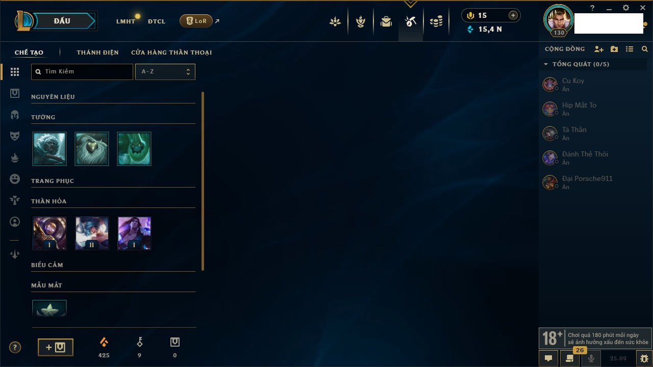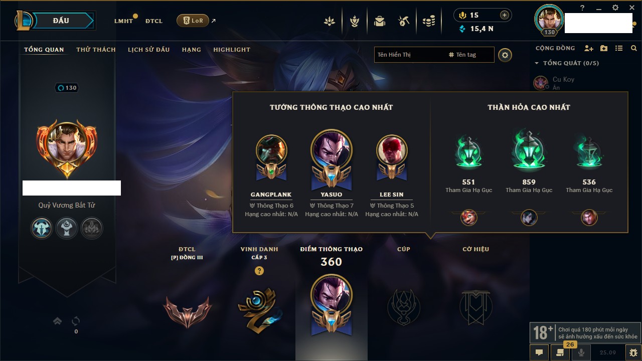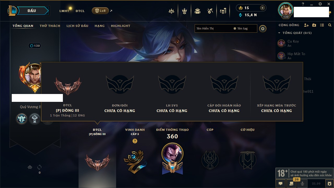Rank Đơn: Chưa RankKhung: Chưa có khungTướng: 171 - Còn 164047 THXTrang Phục: 173Rank ĐTCL: Chưa RankLinh Thú: 77
