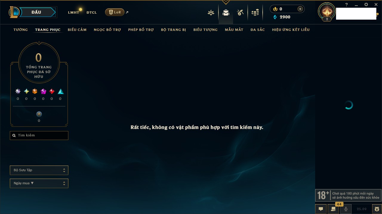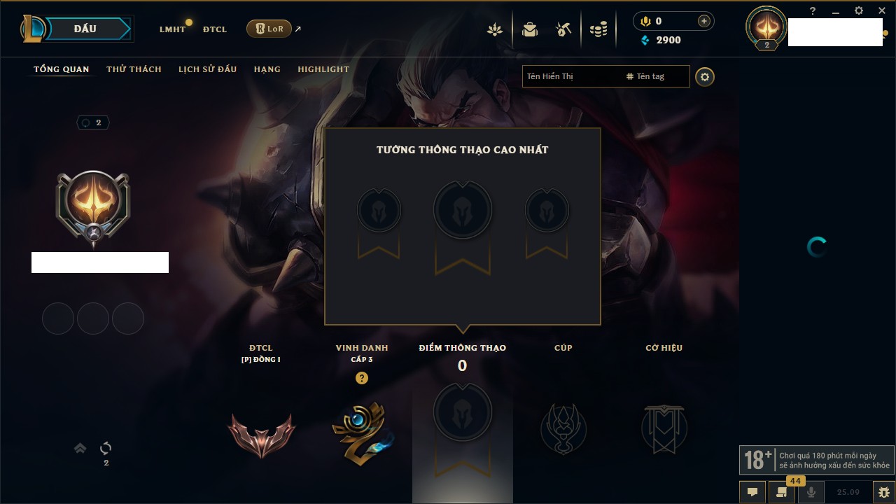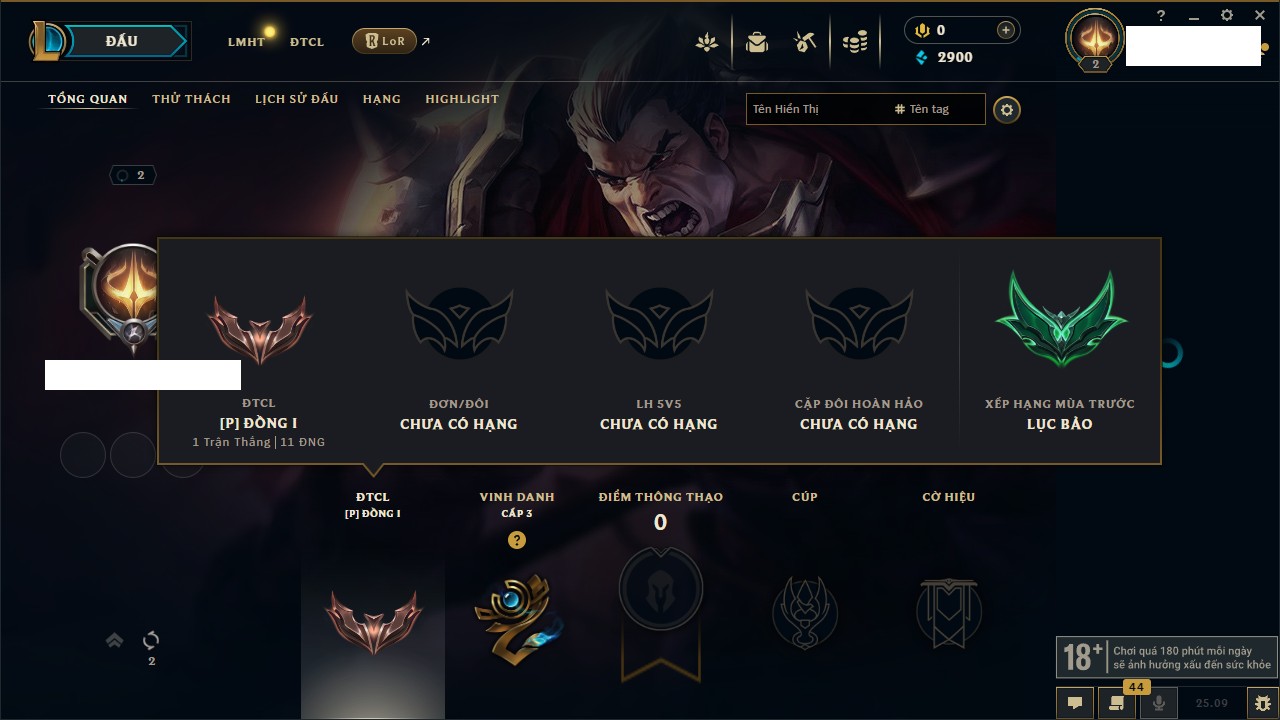Rank Đơn: Chưa RankKhung: Chưa có khungTướng: 165 - Còn 1609 THXTrang Phục: 25Rank ĐTCL: Chưa RankLinh Thú: 44