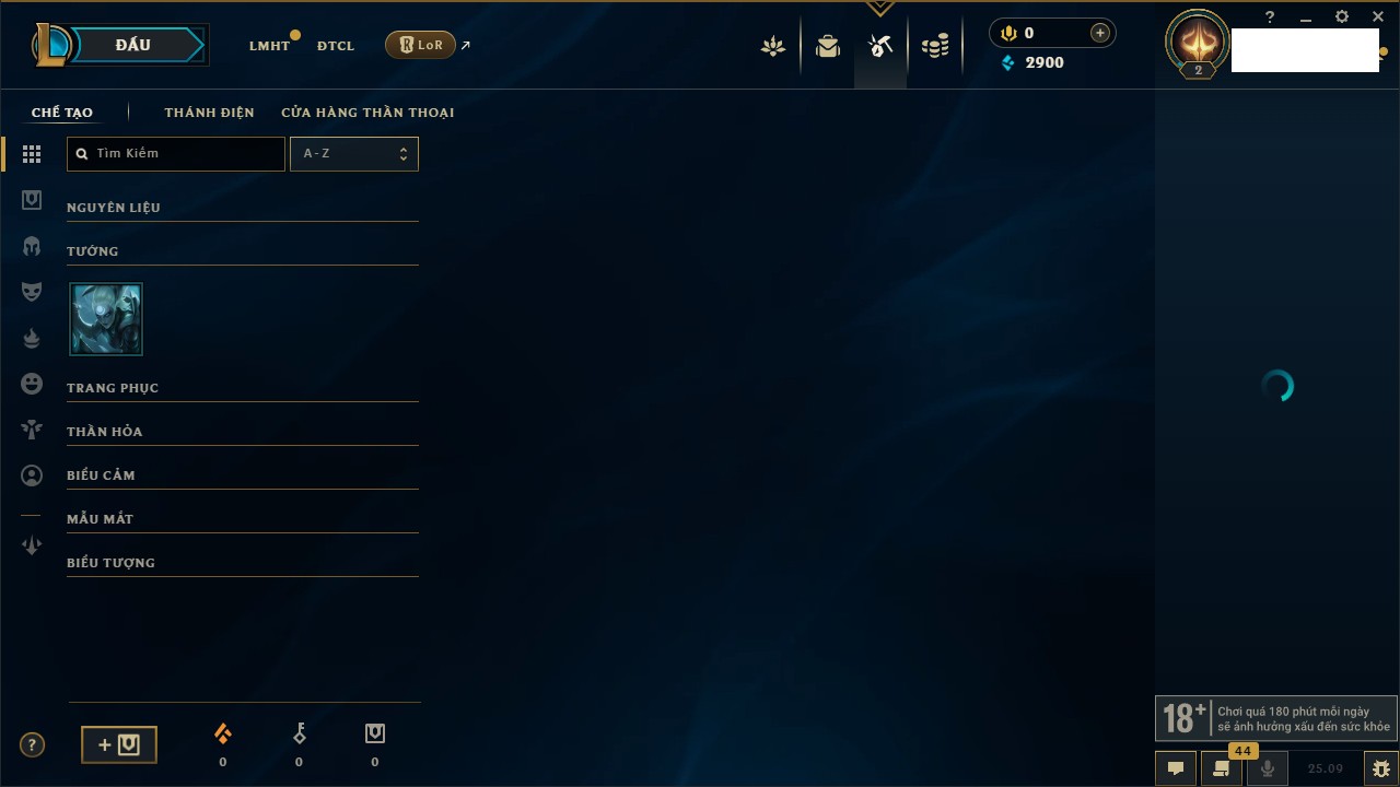 Rank Đơn: Sắt IVKhung: SắtTướng: 171 - Còn 231744 THXTrang Phục: 376Rank ĐTCL: Bạch Kim IILinh Thú: 120
