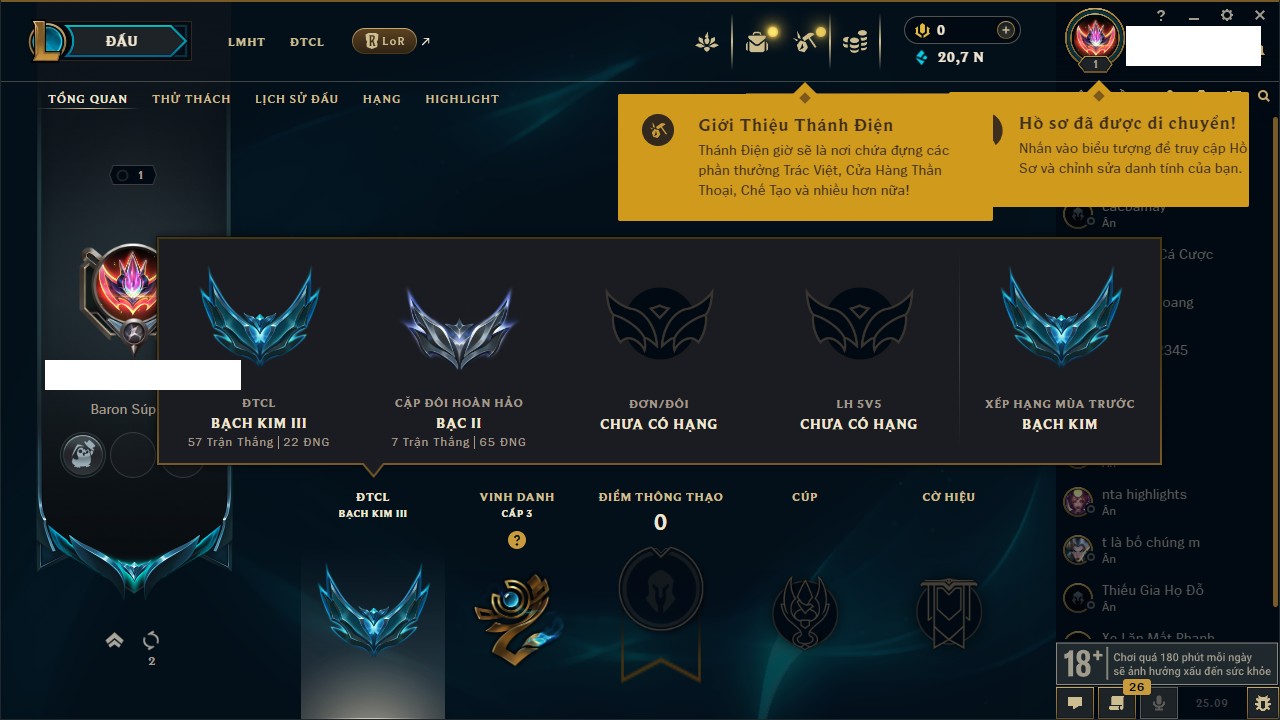 Rank Đơn: Bạch Kim IIIKhung: Lục BảoTướng: 172 - Còn 453285 THXTrang Phục: 220Rank ĐTCL: Chưa RankLinh Thú: 104
