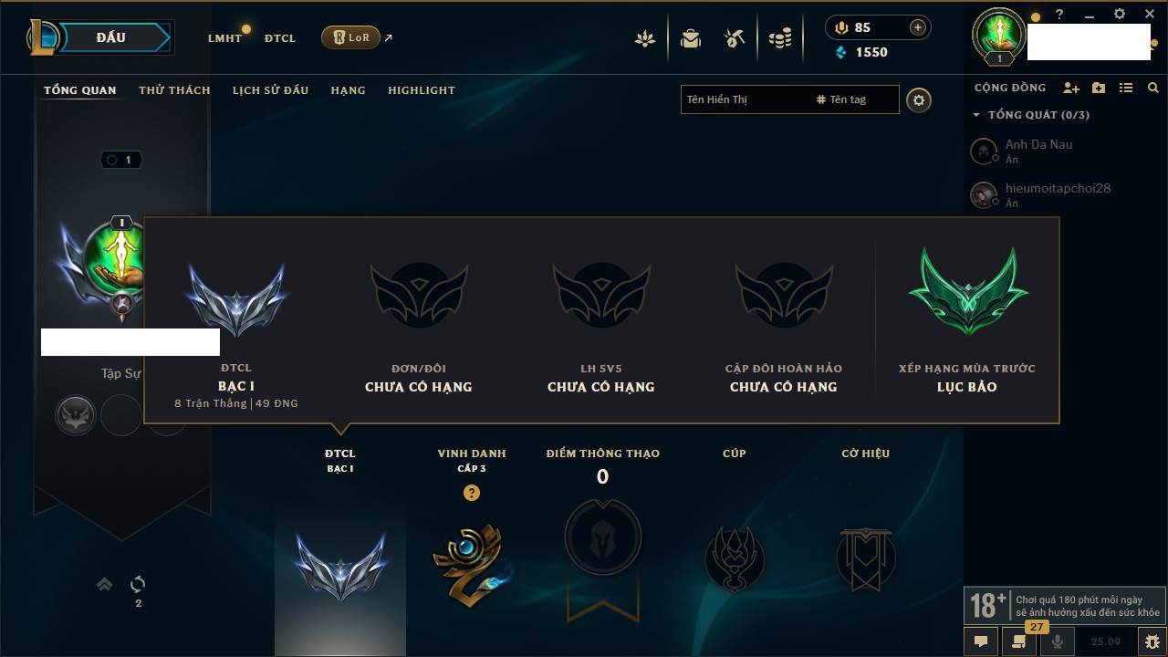 Rank Đơn: Vàng IKhung: Bạch kimTướng: 170 - Còn 212450 THXTrang Phục: 214Rank ĐTCL: Bạch Kim IVLinh Thú: 221
