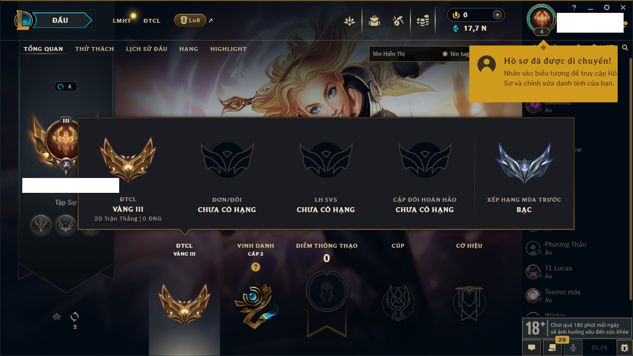 Rank Đơn: Bạc IIKhung: VàngTướng: 171 - Còn 332462 THXTrang Phục: 165Rank ĐTCL: Kim Cương IVLinh Thú: 181