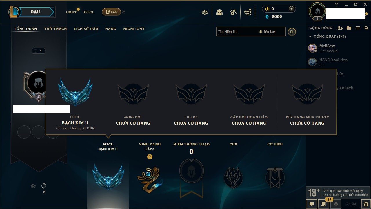 Rank Đơn: Chưa rank mùa nàoKhung: Chưa có khungTướng: 1 - Còn 9000 THXTrang Phục: 0Rank ĐTCL: Bạch Kim IIILinh Thú: 14
