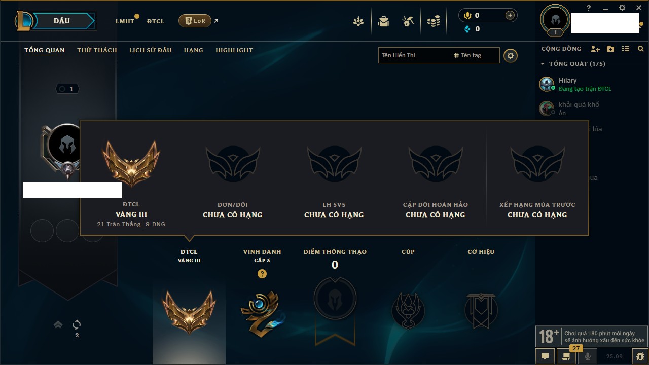 Rank Đơn: Chưa rank mùa nàoKhung: Chưa có khungTướng: 0 - Còn 6300 THXTrang Phục: 0Rank ĐTCL: Bạc IIILinh Thú: 3