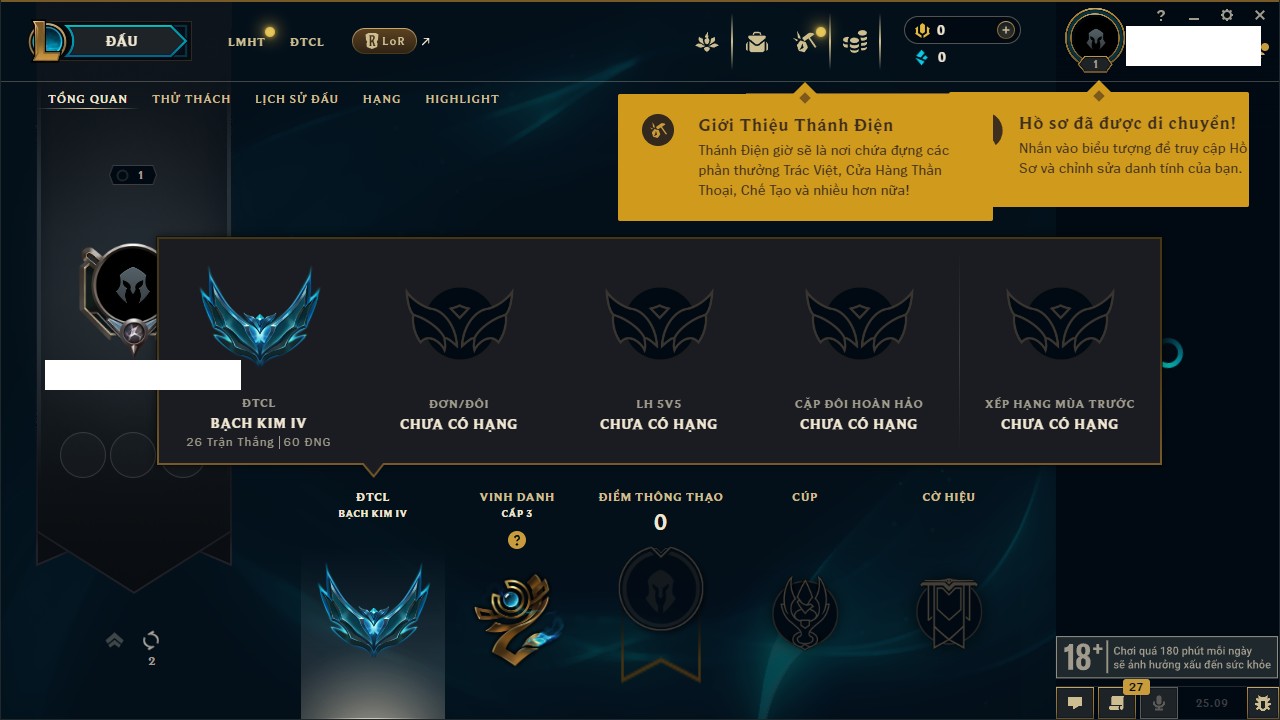 Rank Đơn: Chưa rank mùa nàoKhung: Chưa có khungTướng: 0 - Còn 3000 THXTrang Phục: 0Rank ĐTCL: Bạch Kim IVLinh Thú: 11