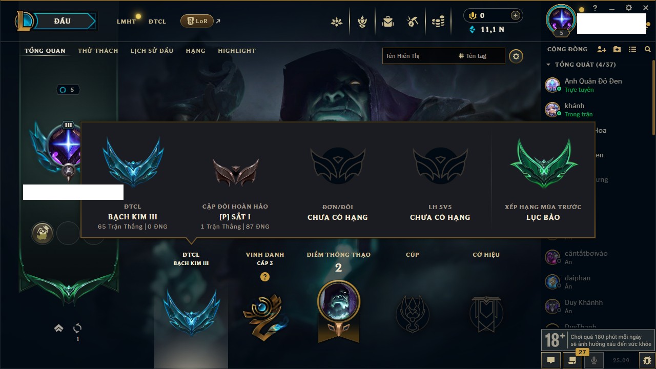 Rank Đơn: Chưa RankKhung: Chưa có khungTướng: 165 - Còn 3214 THXTrang Phục: 160Rank ĐTCL: Chưa RankLinh Thú: 28