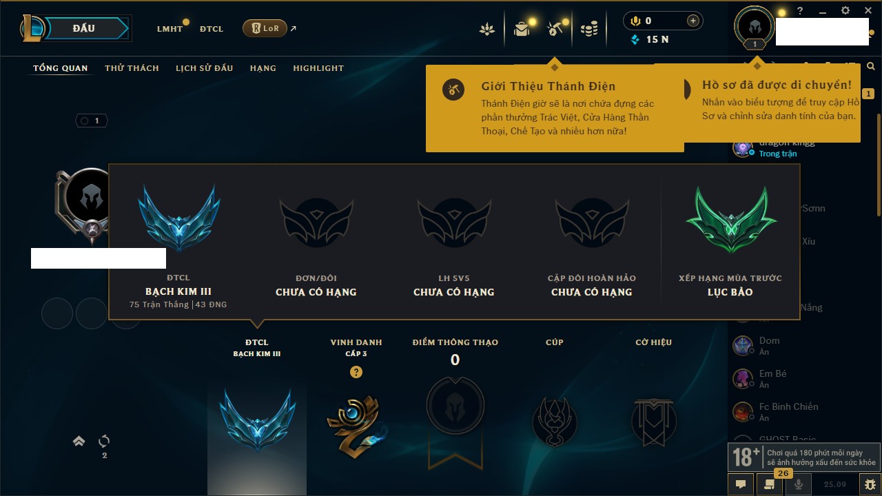 Rank Đơn: Bạc IIKhung: VàngTướng: 171 - Còn 332462 THXTrang Phục: 165Rank ĐTCL: Kim Cương IVLinh Thú: 181