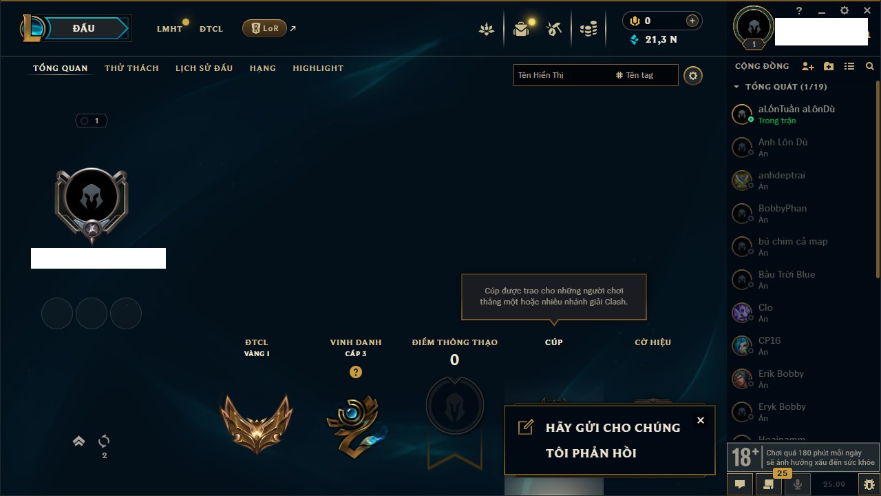 Rank Đơn: Chưa RankKhung: Chưa có khungTướng: 22 - Còn 1295 THXTrang Phục: 1Rank ĐTCL: Chưa RankLinh Thú: 5