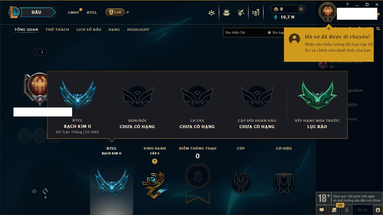 Rank Đơn: Chưa rank mùa nàoKhung: Chưa có khungTướng: 2 - Còn 9000 THXTrang Phục: 0Rank ĐTCL: Bạch Kim IIILinh Thú: 31