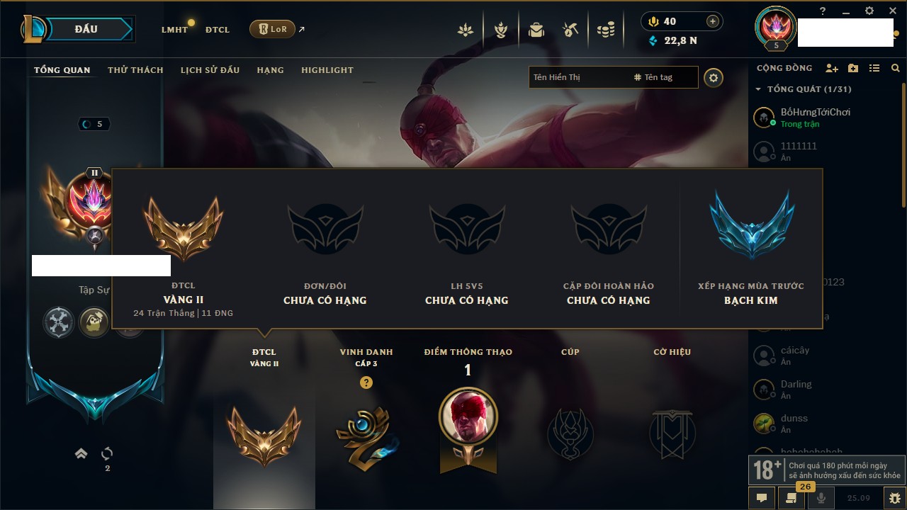 Rank Đơn: Bạc IIKhung: VàngTướng: 171 - Còn 332462 THXTrang Phục: 165Rank ĐTCL: Kim Cương IVLinh Thú: 181