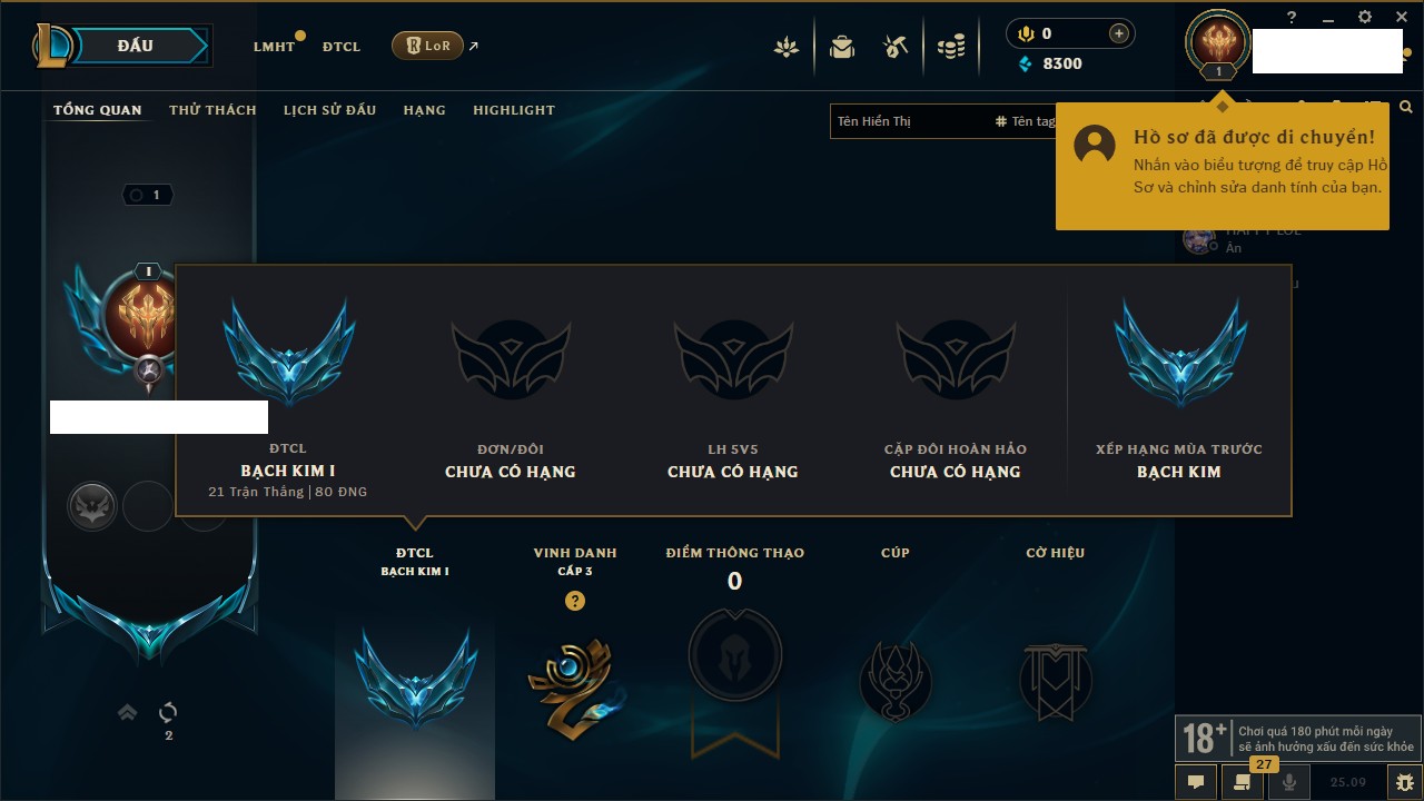 Rank Đơn: Chưa rank mùa nàoKhung: Chưa có khungTướng: 1 - Còn 9000 THXTrang Phục: 0Rank ĐTCL: Bạch Kim IIILinh Thú: 14