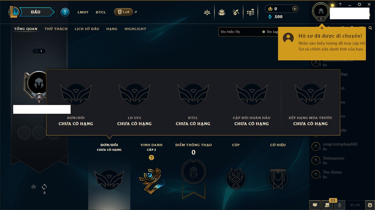 Rank Đơn: Lục Bảo IVKhung: VàngTướng: 171 - Còn 154648 THXTrang Phục: 203Rank ĐTCL: Bạch Kim IVLinh Thú: 69