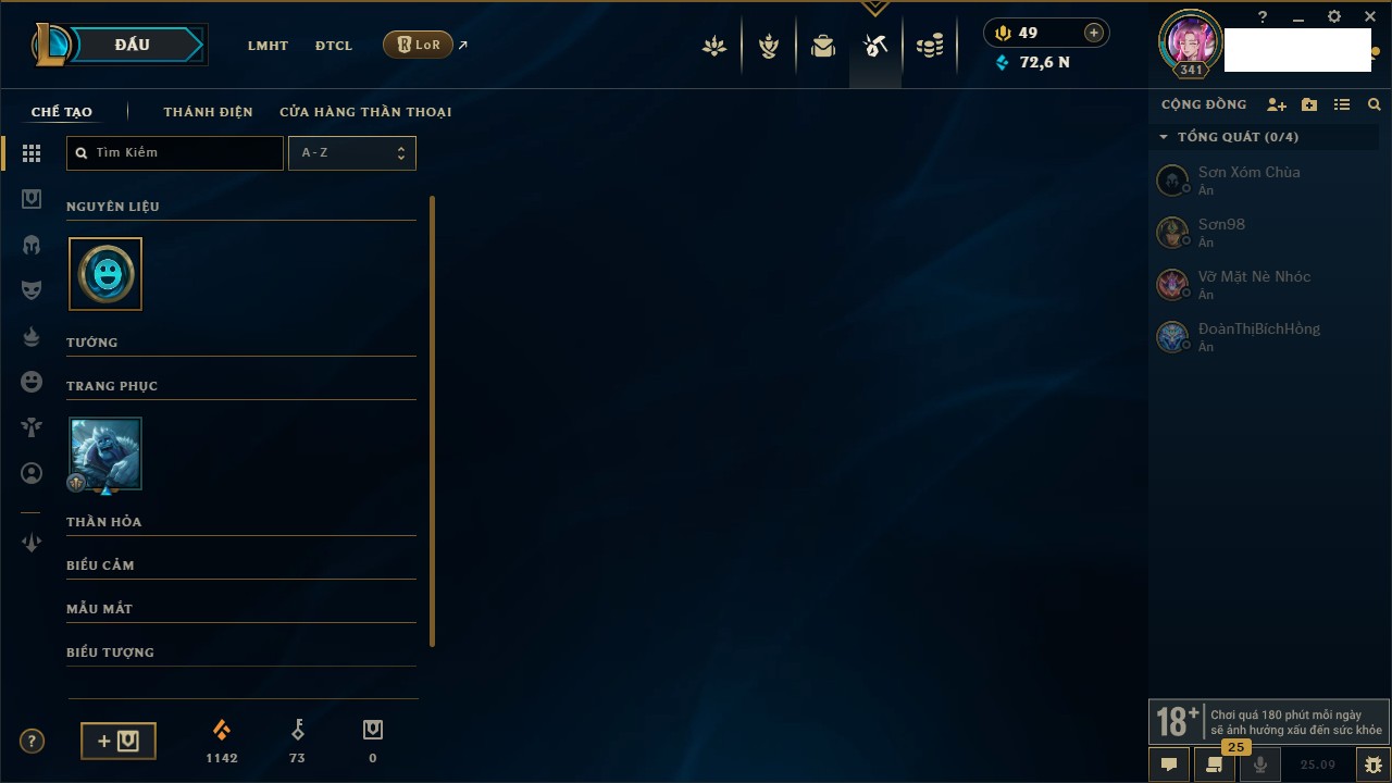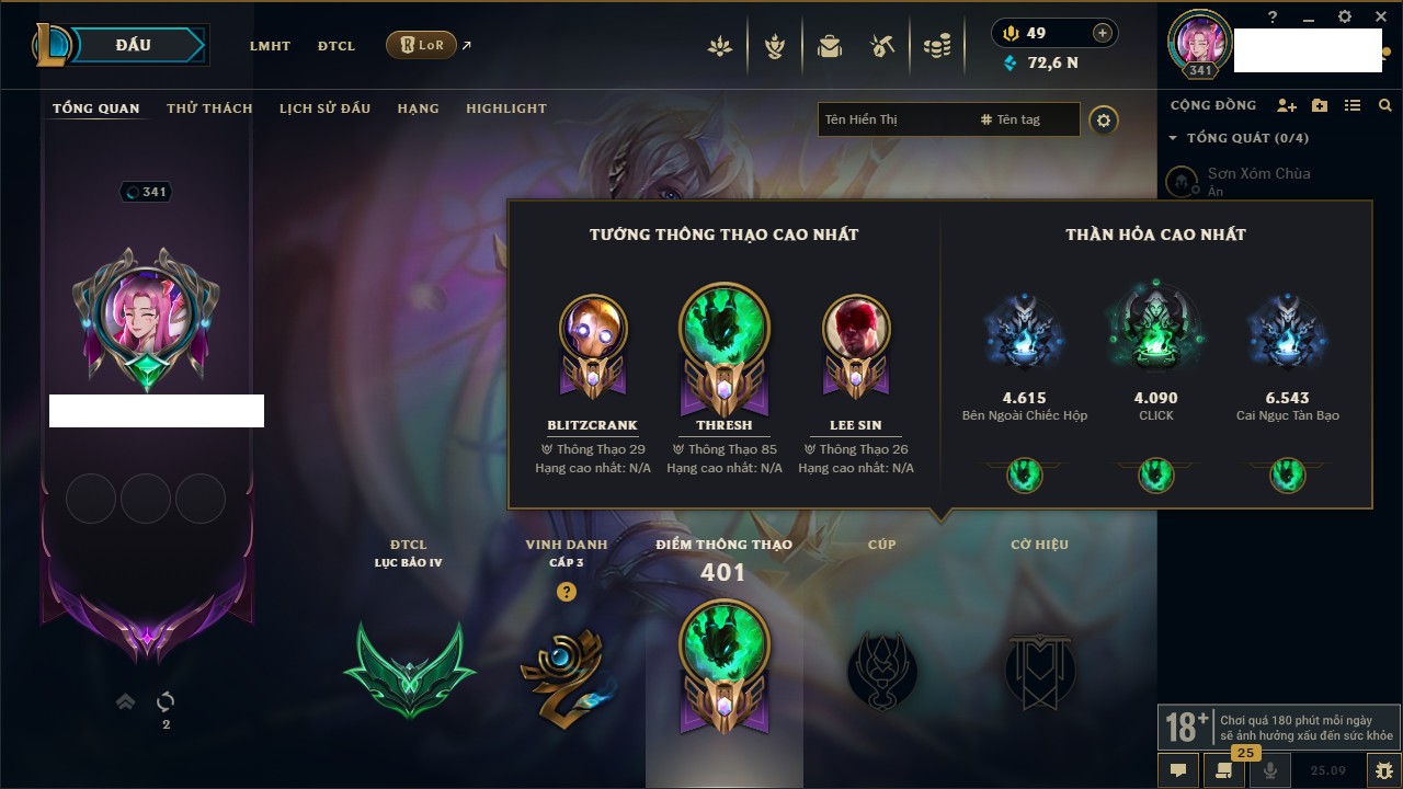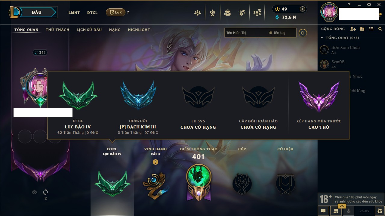 Rank Đơn: Lục Bảo IVKhung: VàngTướng: 171 - Còn 154648 THXTrang Phục: 203Rank ĐTCL: Bạch Kim IVLinh Thú: 69