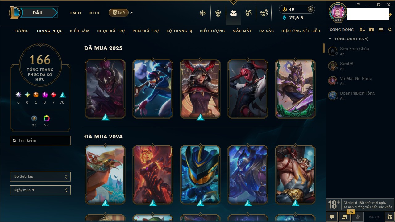 Rank Đơn: Vàng IIIKhung: VàngTướng: 172 - Còn 164704 THXTrang Phục: 255Rank ĐTCL: Kim Cương IVLinh Thú: 156