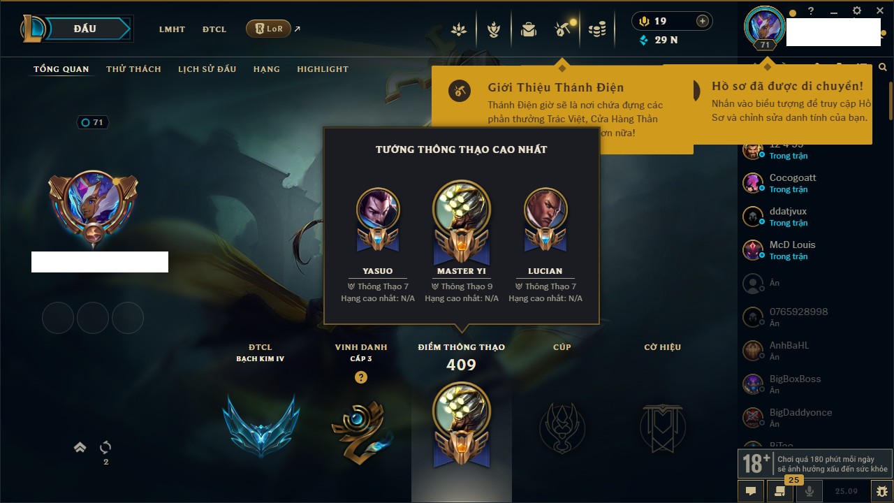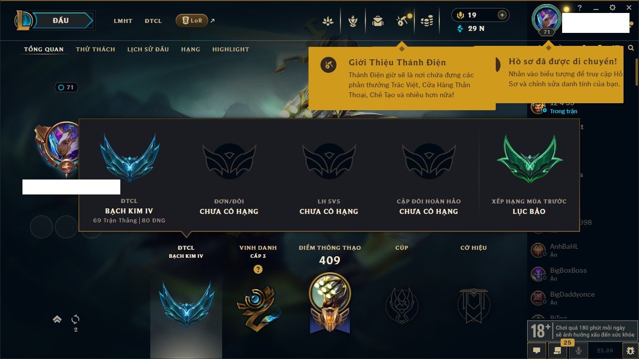 Rank Đơn: Vàng IVKhung: VàngTướng: 146 - Còn 89110 THXTrang Phục: 63Rank ĐTCL: Vàng IIILinh Thú: 41
