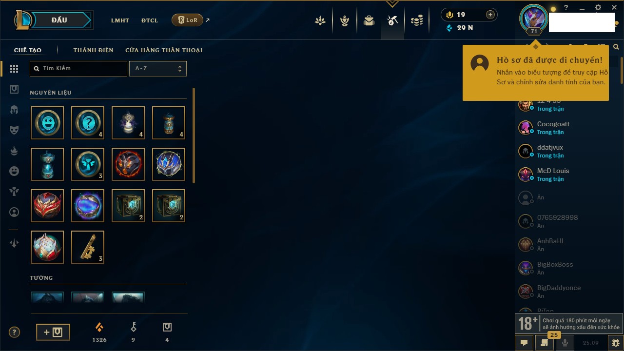 Rank Đơn: Đồng IIKhung: Chưa có khungTướng: 170 - Còn 56487 THXTrang Phục: 90Rank ĐTCL: Chưa RankLinh Thú: 129