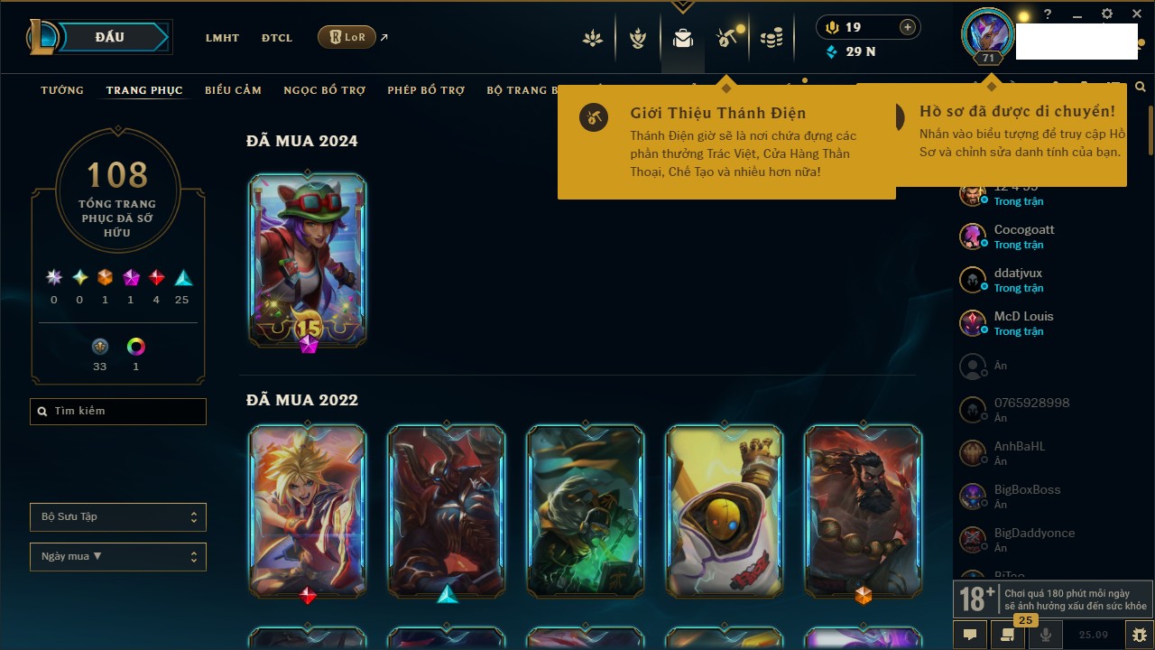 Rank Đơn: Vàng IIIKhung: VàngTướng: 170 - Còn 33222 THXTrang Phục: 136Rank ĐTCL: Chưa RankLinh Thú: 40