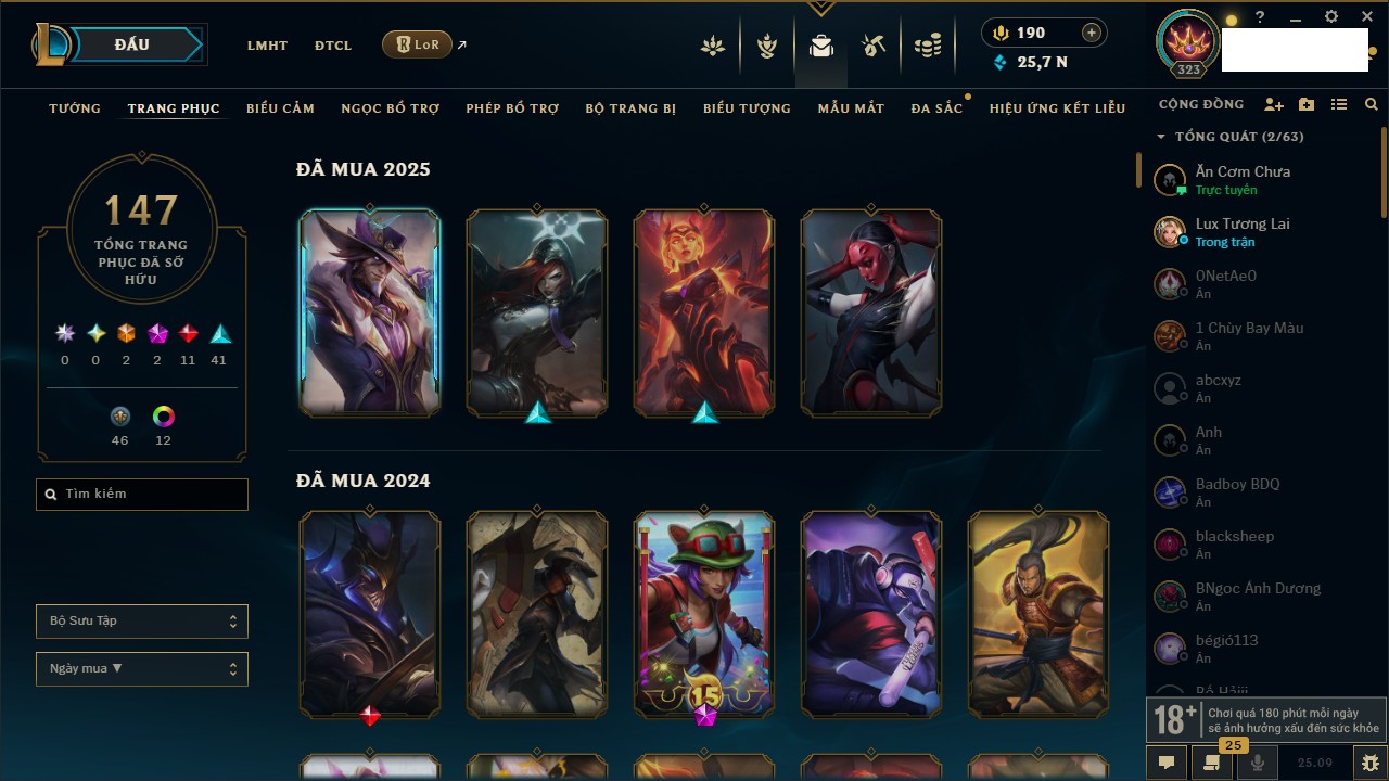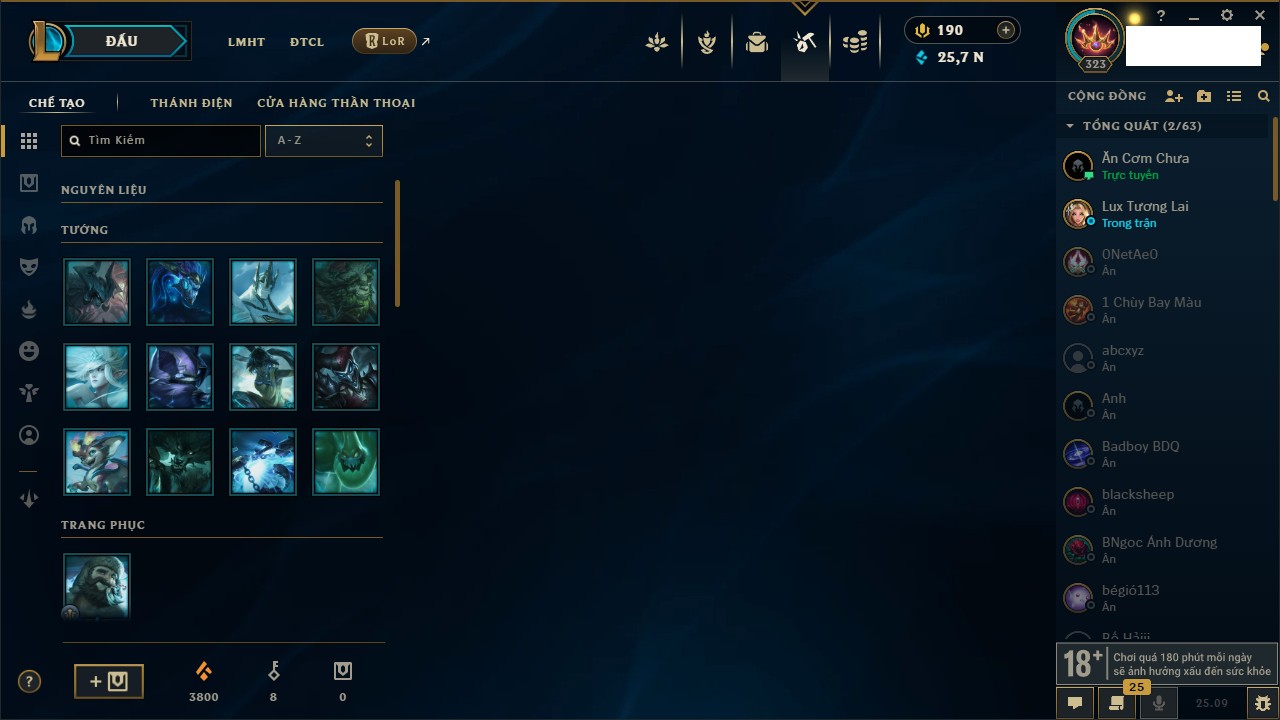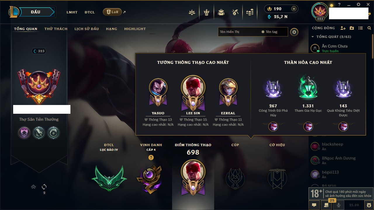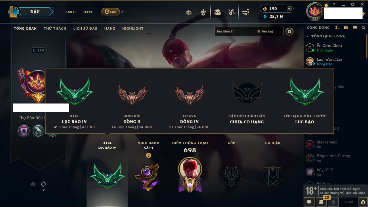 Rank Đơn: Đồng IIKhung: Chưa có khungTướng: 170 - Còn 56487 THXTrang Phục: 90Rank ĐTCL: Chưa RankLinh Thú: 129