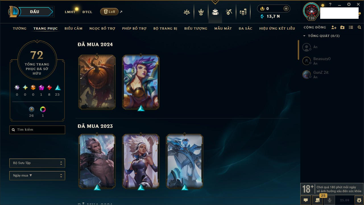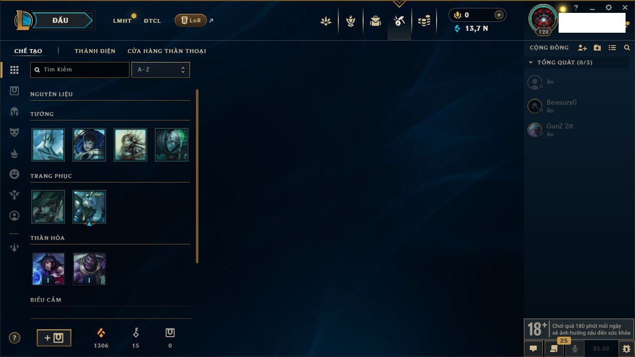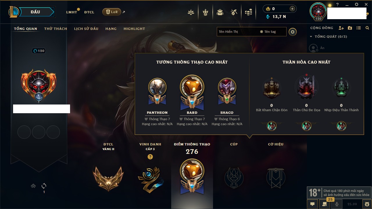 Rank Đơn: Bạch Kim IIKhung: Bạch kimTướng: 171 - Còn 316137 THXTrang Phục: 89Rank ĐTCL: Bạch Kim IIILinh Thú: 94