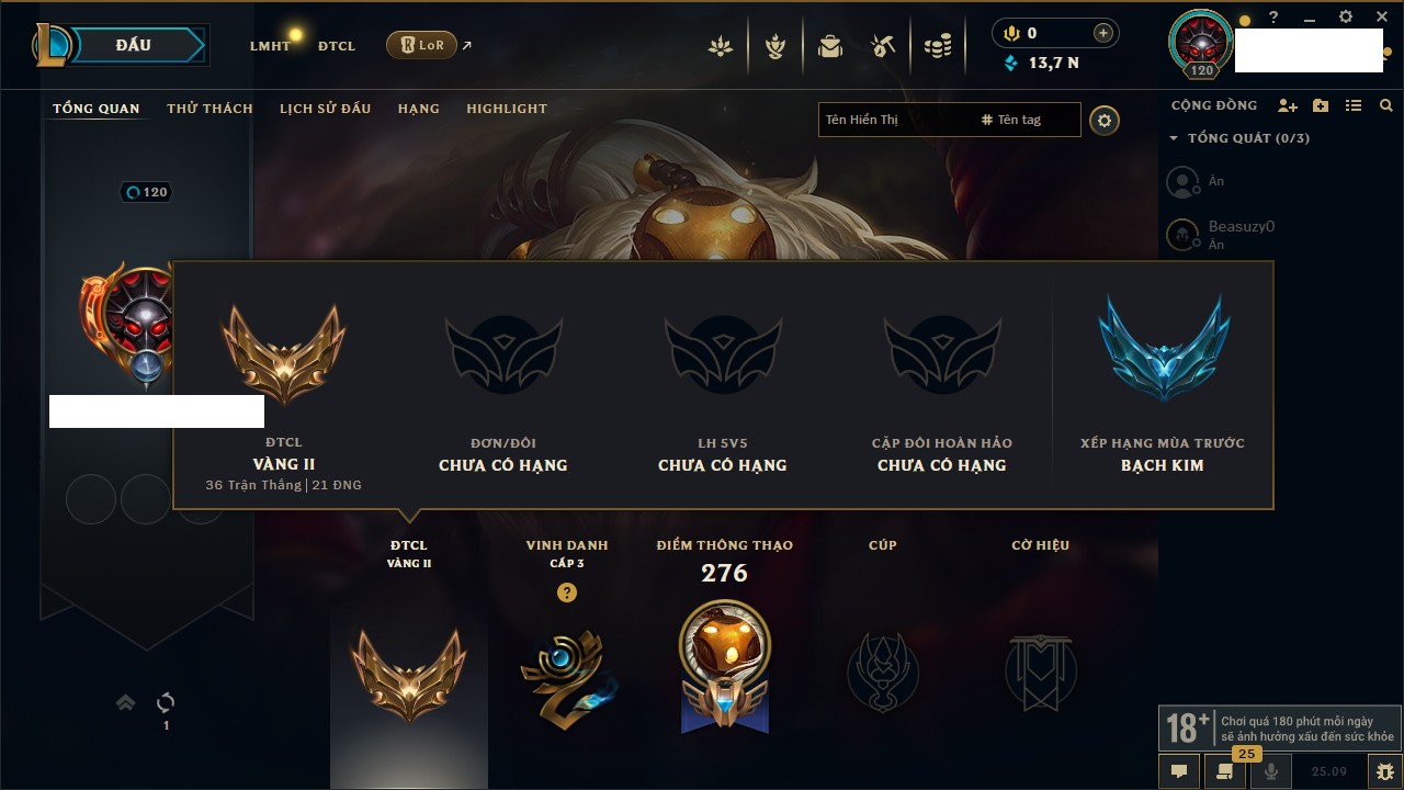Rank Đơn: Bạch Kim IIIKhung: Bạch kimTướng: 171 - Còn 136108 THXTrang Phục: 261Rank ĐTCL: Bạc IVLinh Thú: 73
