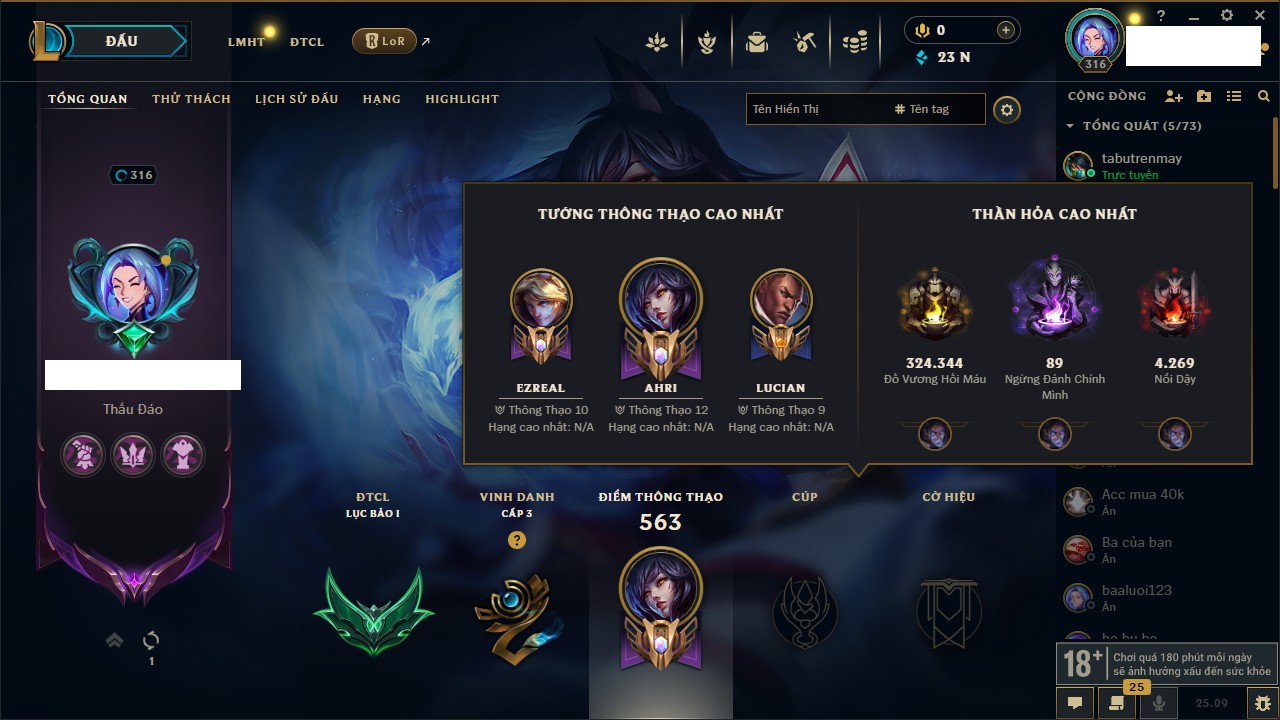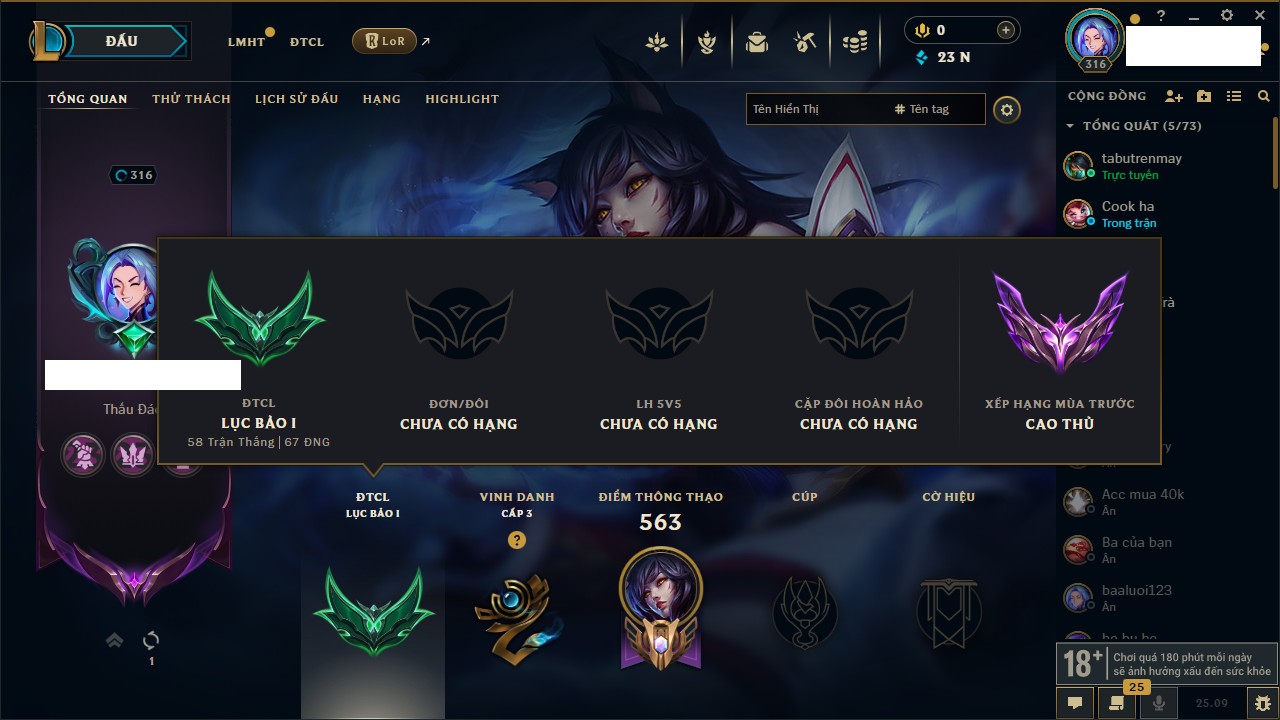 Rank Đơn: Vàng IKhung: Bạch kimTướng: 170 - Còn 212450 THXTrang Phục: 214Rank ĐTCL: Bạch Kim IVLinh Thú: 221