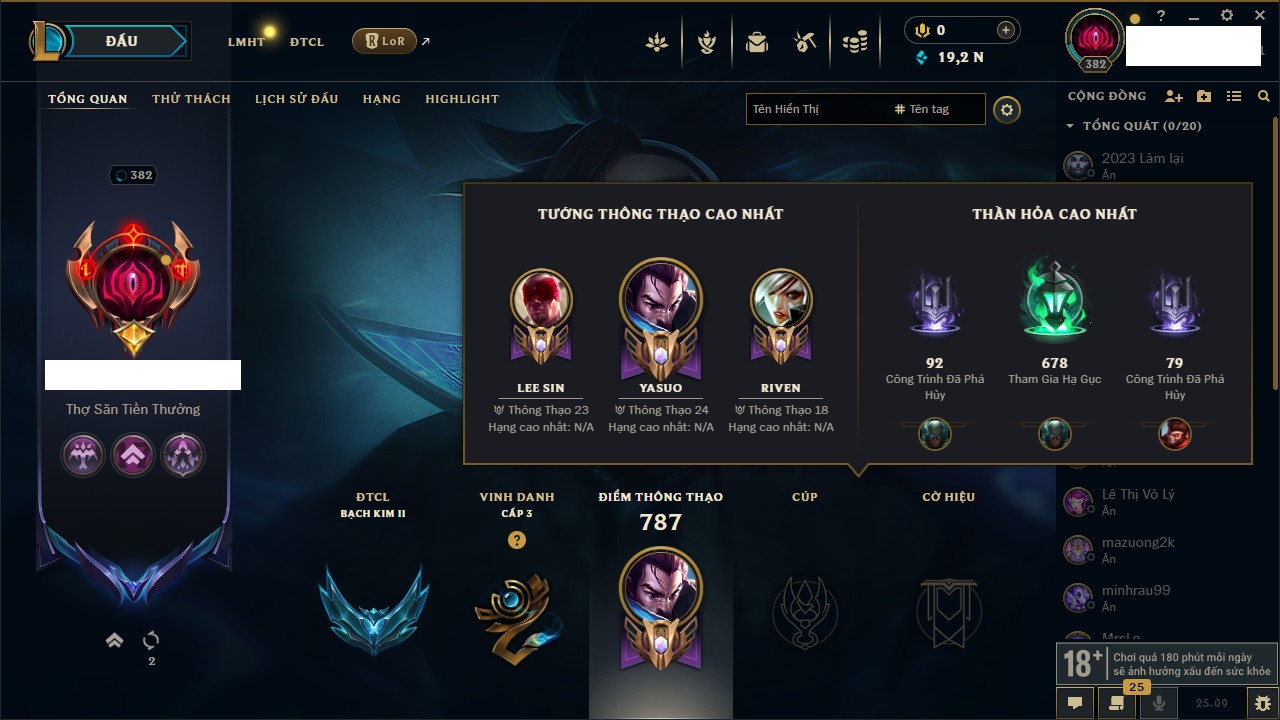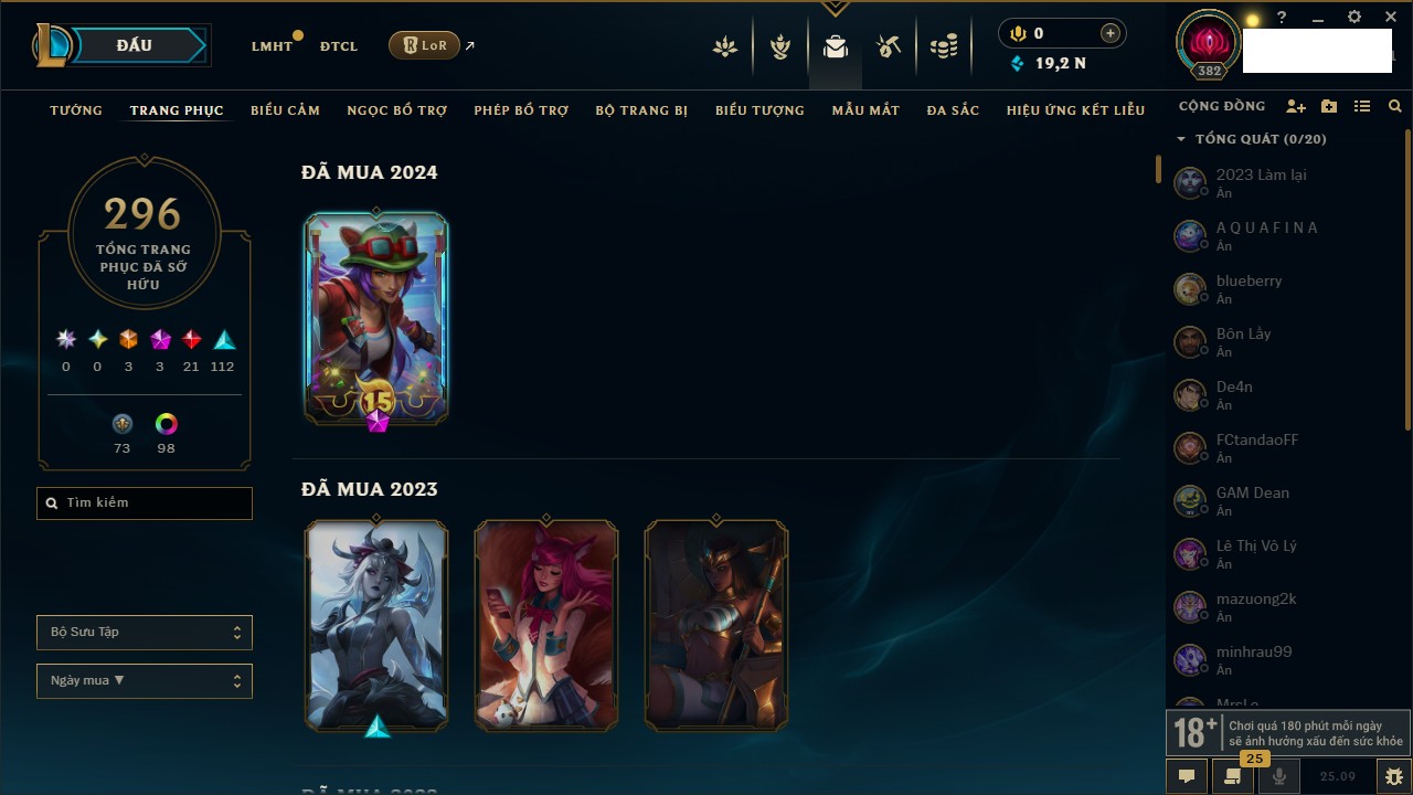 Rank Đơn: Chưa RankKhung: Bạch kimTướng: 171 - Còn 182788 THXTrang Phục: 158Rank ĐTCL: Chưa RankLinh Thú: 56