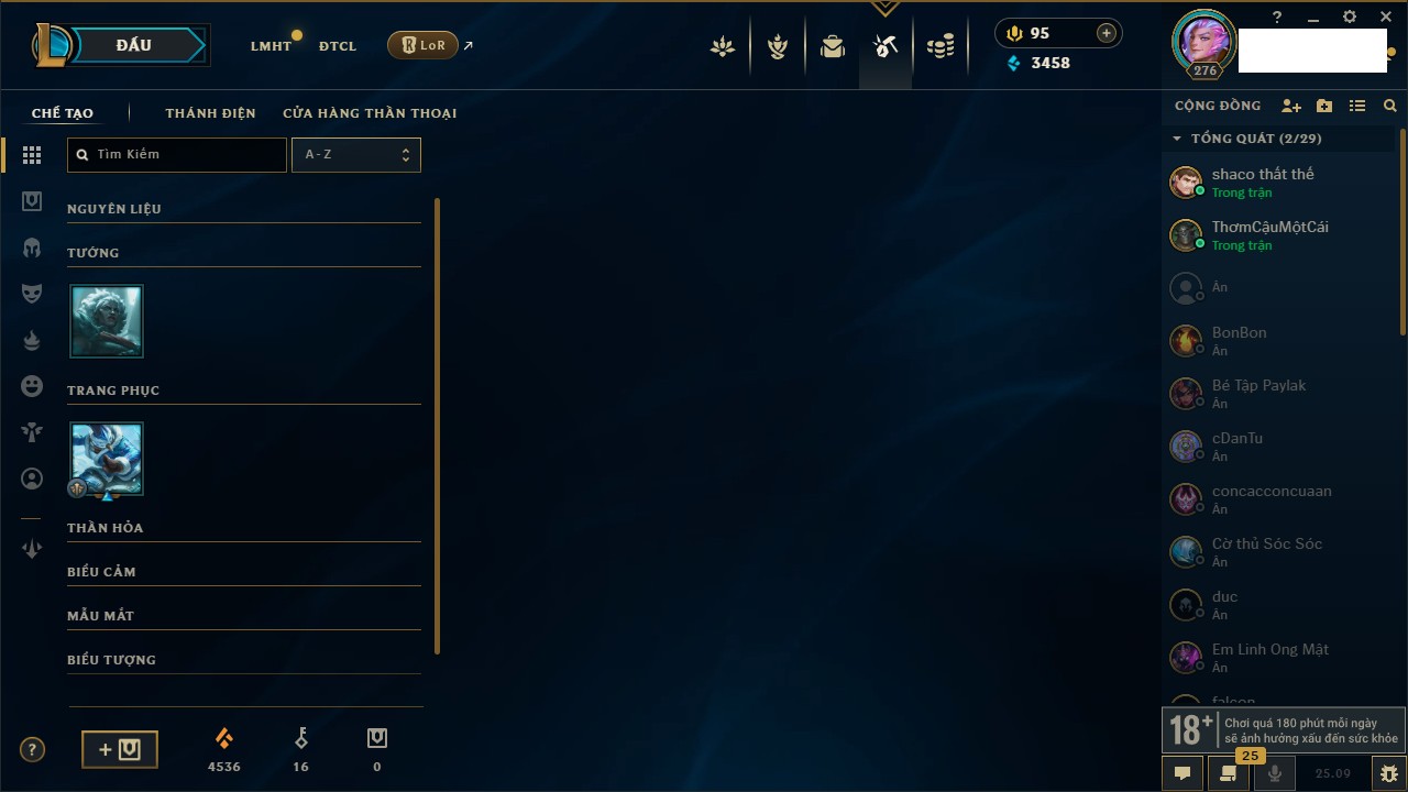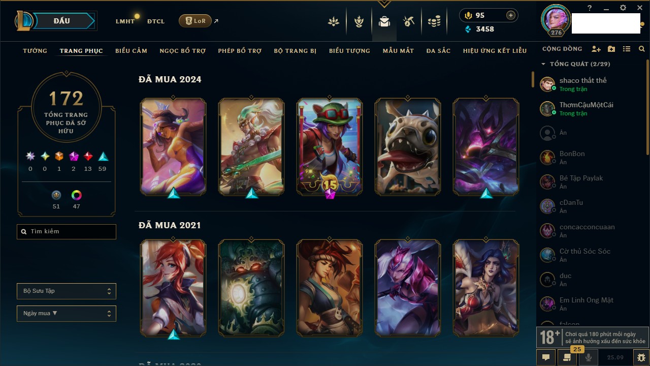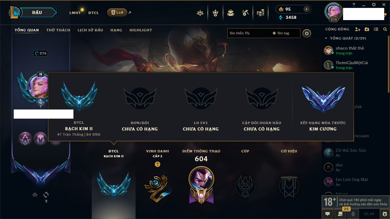 Rank Đơn: Vàng IKhung: Bạch kimTướng: 170 - Còn 212450 THXTrang Phục: 214Rank ĐTCL: Bạch Kim IVLinh Thú: 221