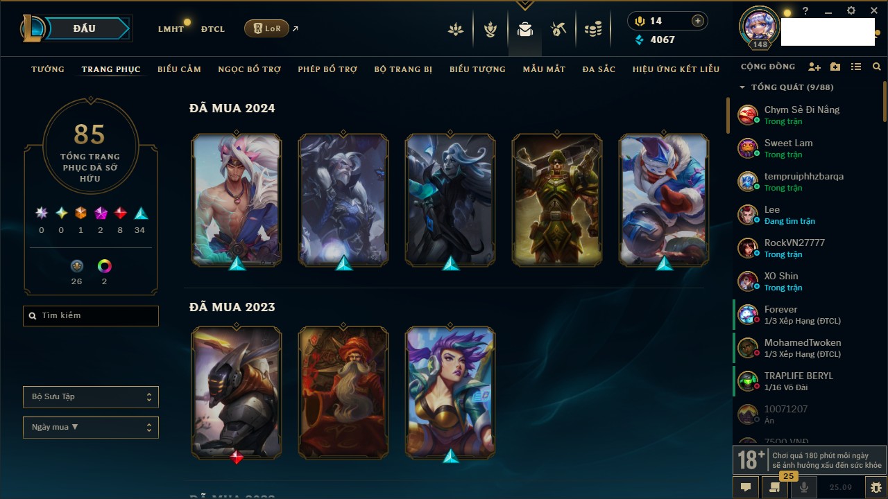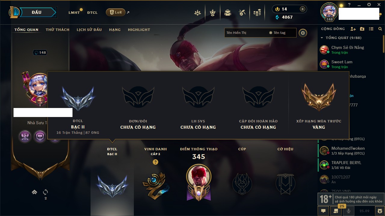 Rank Đơn: Chưa Rank Khung: Chưa có khung Tướng: 165 - Còn 4067 THX Trang Phục: 85 Rank ĐTCL: Chưa Rank Linh Thú: 203
