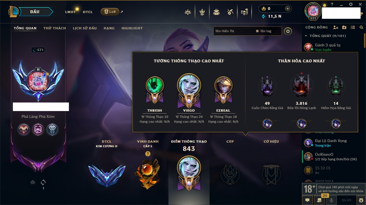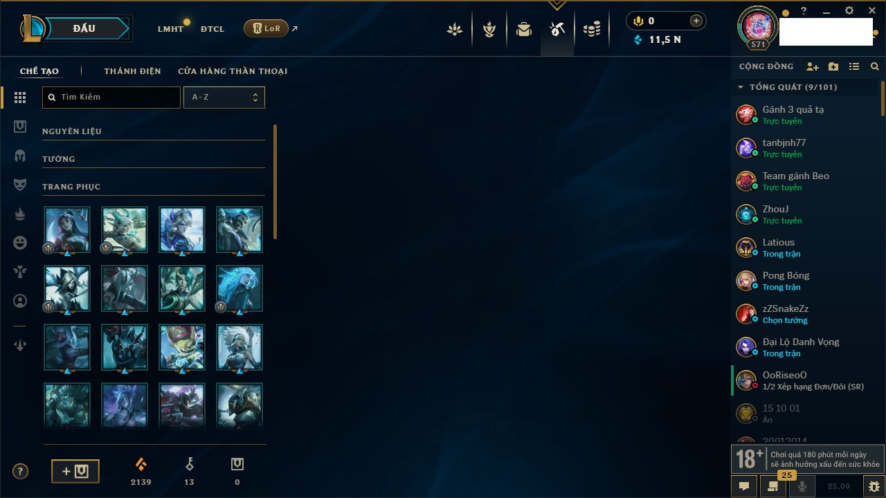 Rank Đơn: Bạc IIIKhung: Chưa có khungTướng: 171 - Còn 21493 THXTrang Phục: 252Rank ĐTCL: Bạch Kim IVLinh Thú: 123