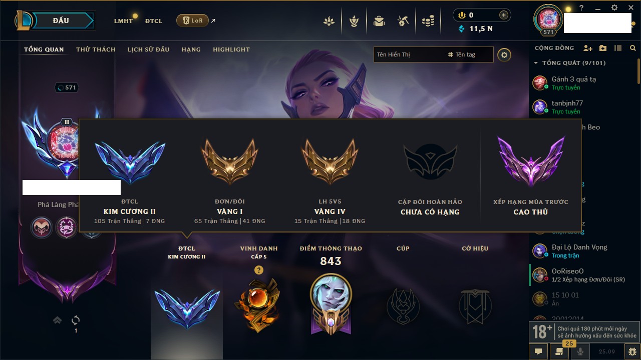 Rank Đơn: Bạch Kim IIIKhung: VàngTướng: 126 - Còn 23055 THXTrang Phục: 114Rank ĐTCL: Chưa RankLinh Thú: 21