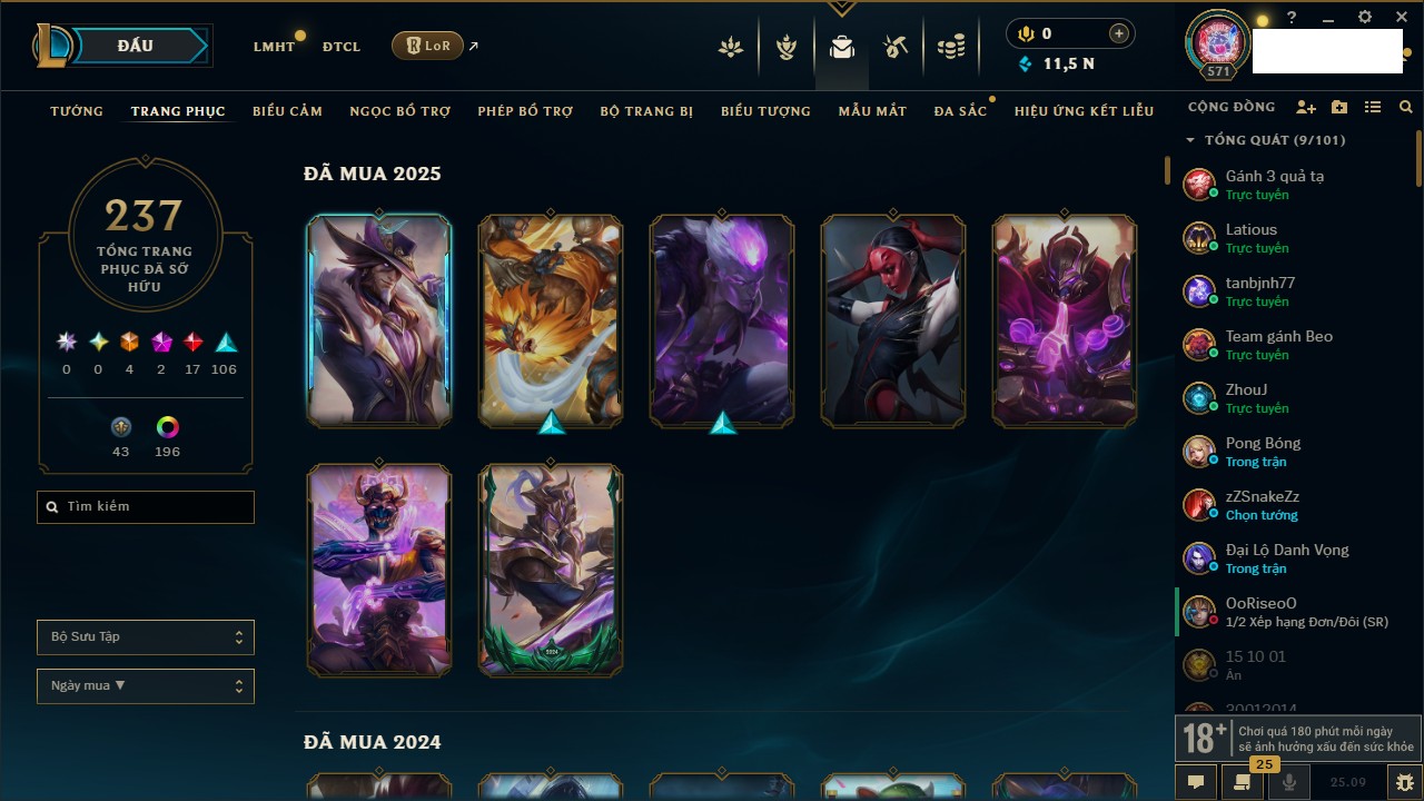 Rank Đơn: Bạc IIKhung: Chưa có khungTướng: 169 - Còn 145151 THXTrang Phục: 237Rank ĐTCL: Chưa RankLinh Thú: 102