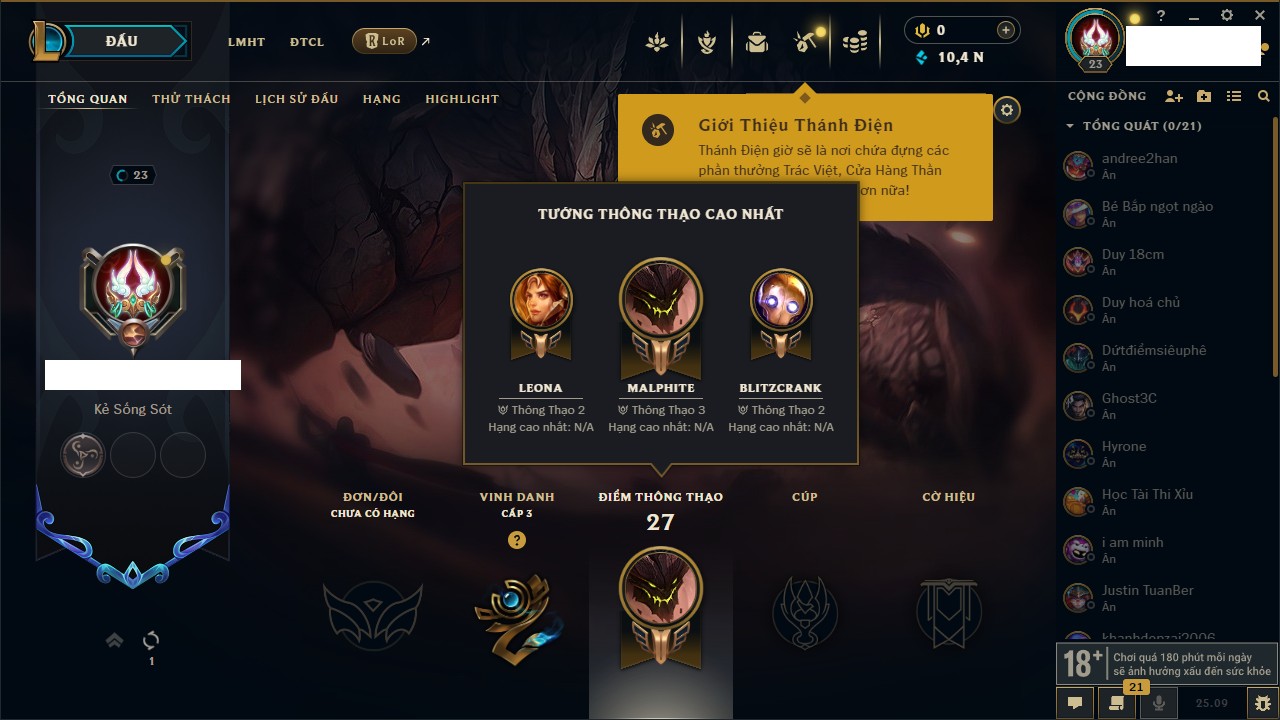 Rank Đơn: Vàng IVKhung: BạcTướng: 166 - Còn 180925 THXTrang Phục: 163Rank ĐTCL: Chưa RankLinh Thú: 67