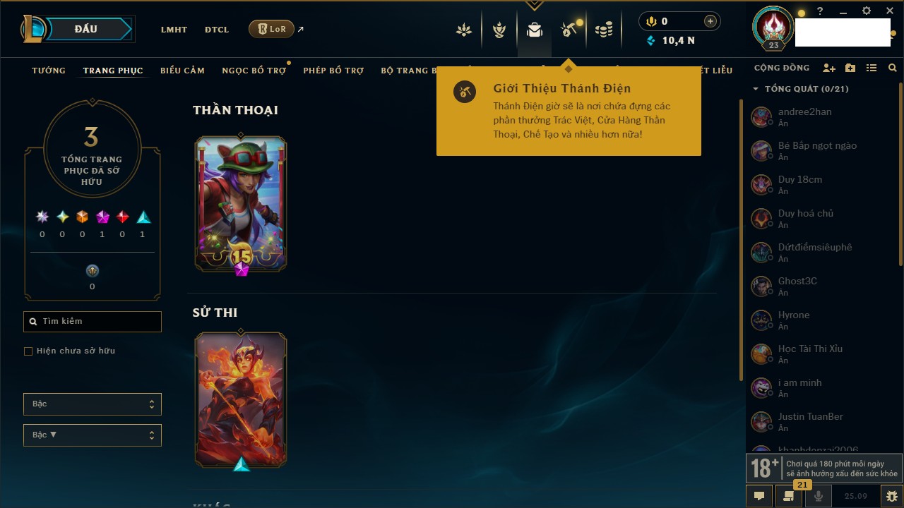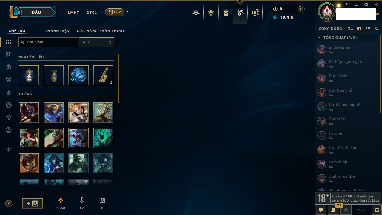 Rank Đơn: Bạc IVKhung: VàngTướng: 172 - Còn 358384 THXTrang Phục: 177Rank ĐTCL: Lục Bảo IILinh Thú: 211