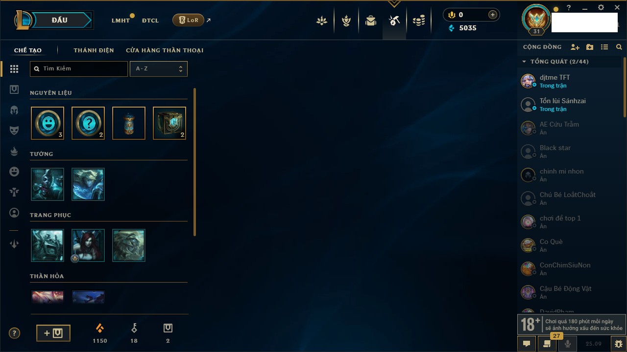 Rank Đơn: Vàng IIKhung: VàngTướng: 171 - Còn 34018 THXTrang Phục: 250Rank ĐTCL: Sắt IILinh Thú: 19