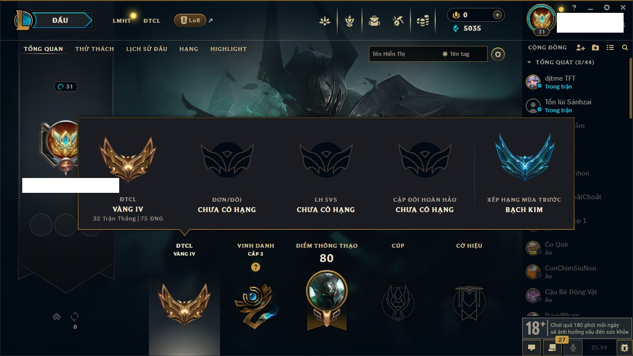 Rank Đơn: Bạch Kim IIIKhung: VàngTướng: 126 - Còn 23055 THXTrang Phục: 114Rank ĐTCL: Chưa RankLinh Thú: 21