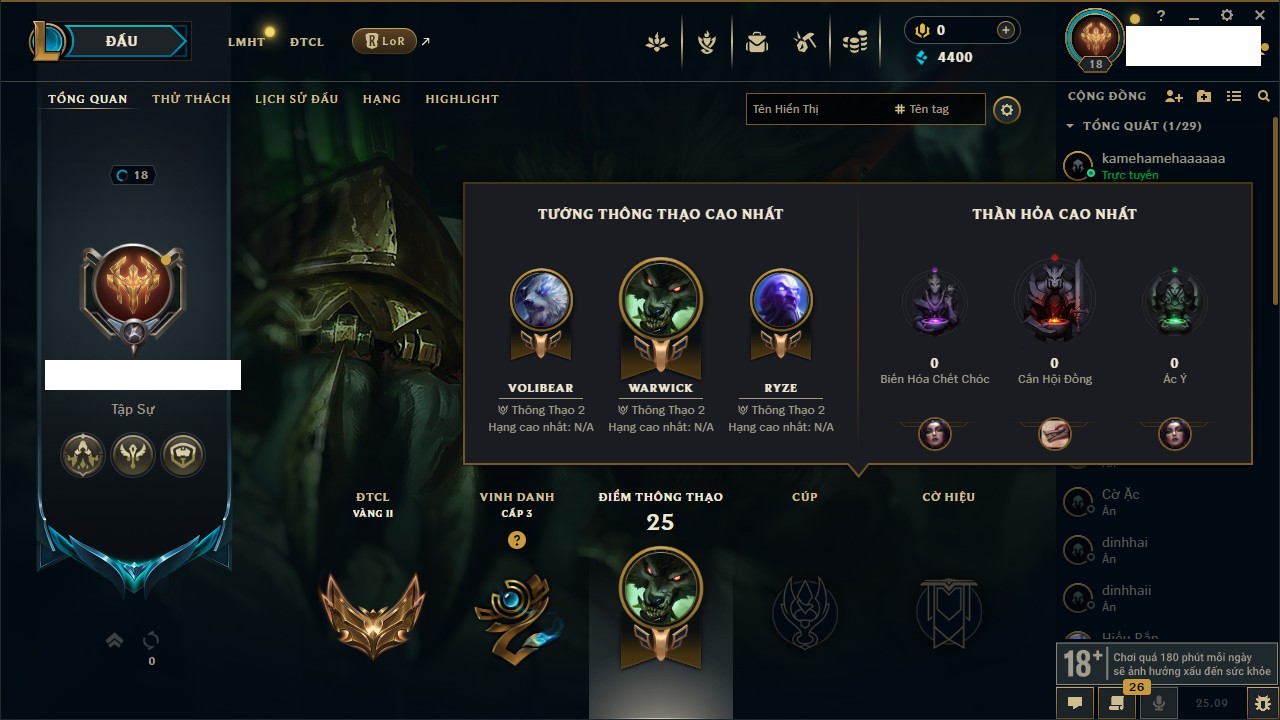 Rank Đơn: Đồng IIIKhung: ĐồngTướng: 170 - Còn 48082 THXTrang Phục: 272Rank ĐTCL: Chưa RankLinh Thú: 84
