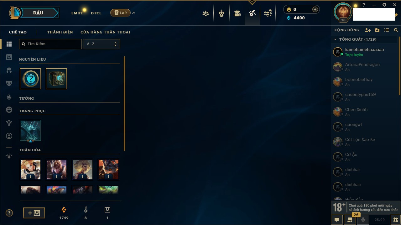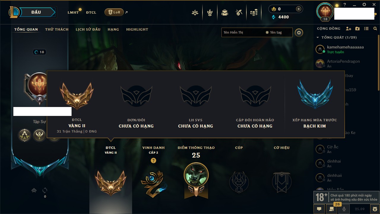 Rank Đơn: Bạch Kim IVKhung: Bạch kimTướng: 171 - Còn 182788 THXTrang Phục: 158Rank ĐTCL: Lục Bảo IVLinh Thú: 56
