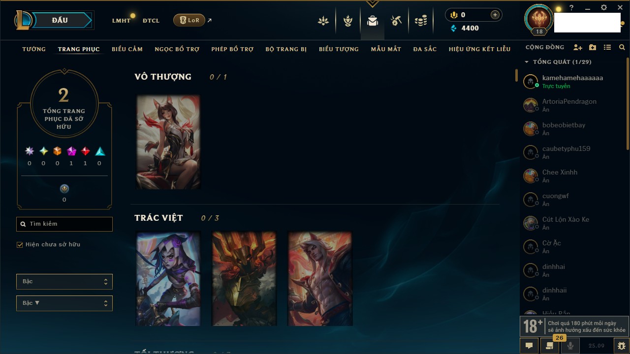 Rank Đơn: Vàng IIKhung: VàngTướng: 170 - Còn 330764 THXTrang Phục: 294Rank ĐTCL: Chưa RankLinh Thú: 58