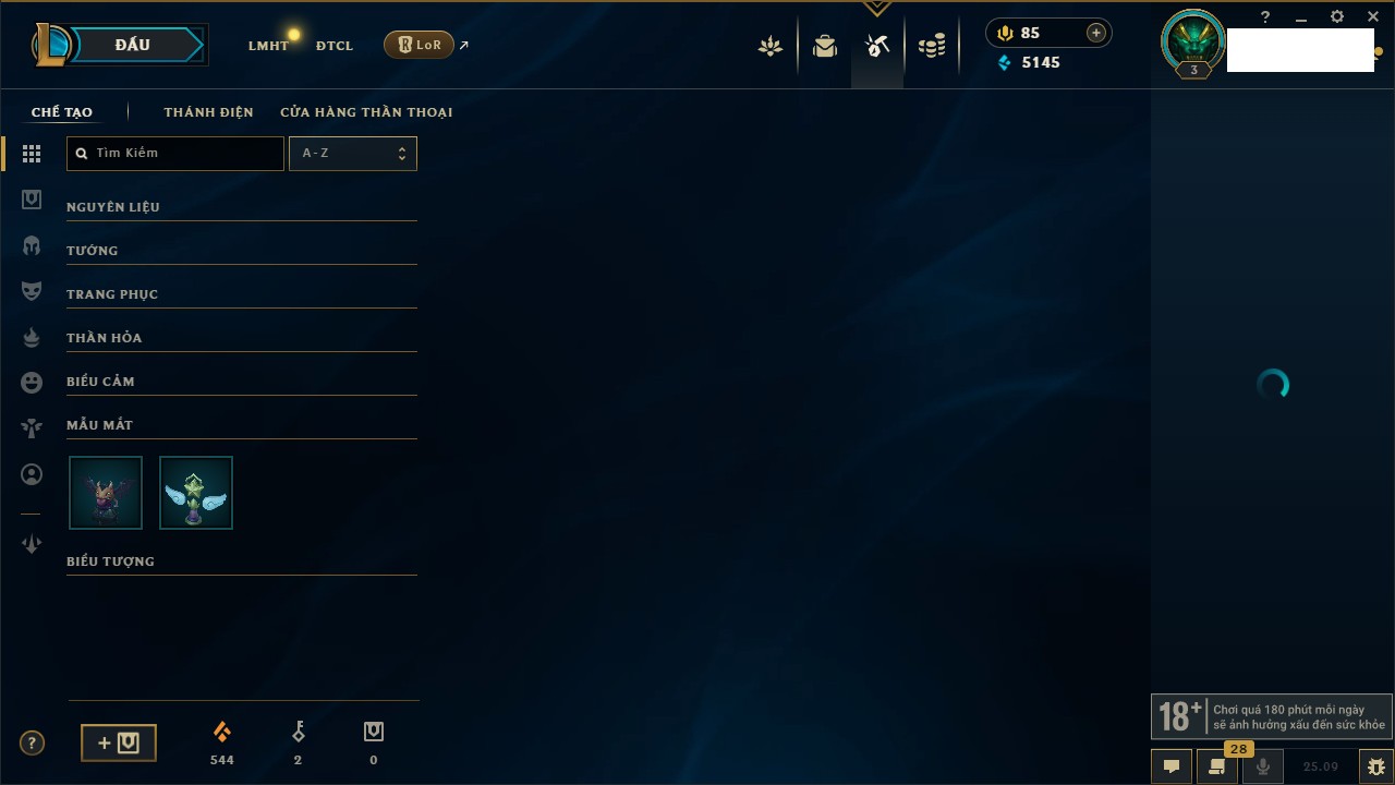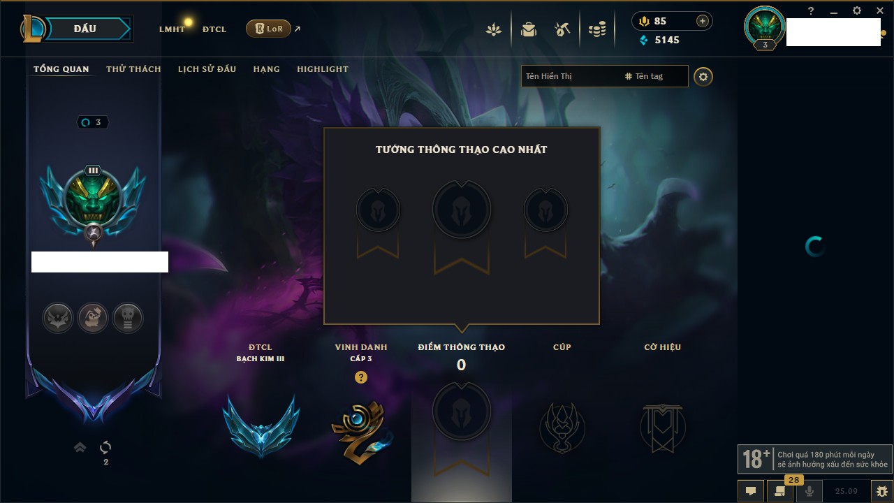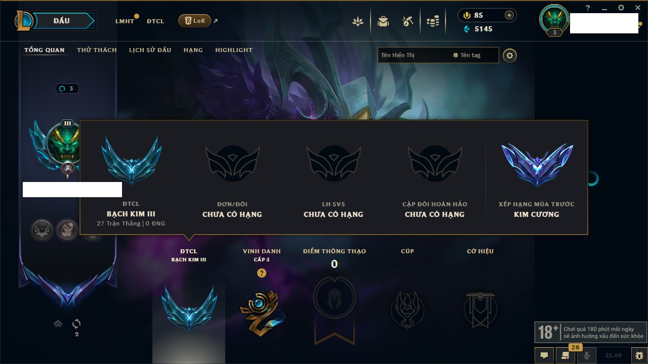 Rank Đơn: Bạch Kim IVKhung: Bạch kimTướng: 171 - Còn 182788 THXTrang Phục: 158Rank ĐTCL: Lục Bảo IVLinh Thú: 56