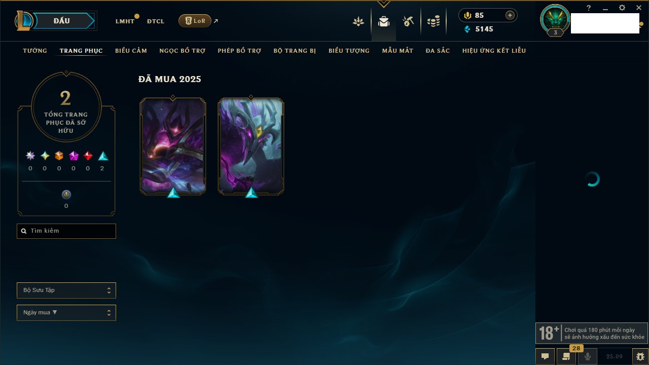 Rank Đơn: Đồng IIIKhung: ĐồngTướng: 170 - Còn 48082 THXTrang Phục: 272Rank ĐTCL: Chưa RankLinh Thú: 84