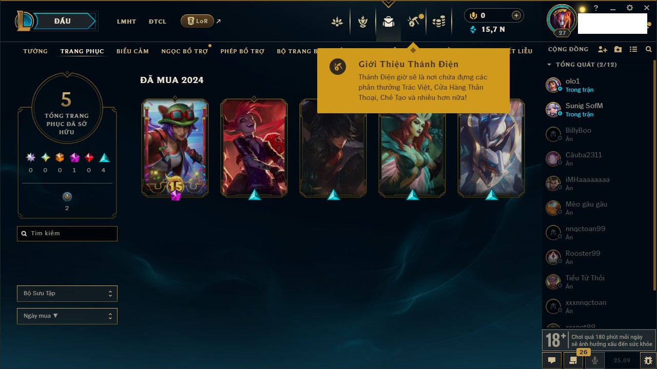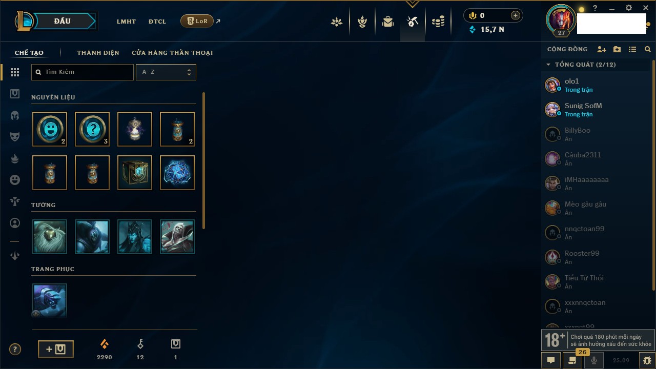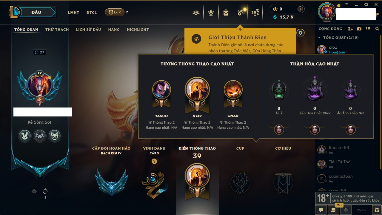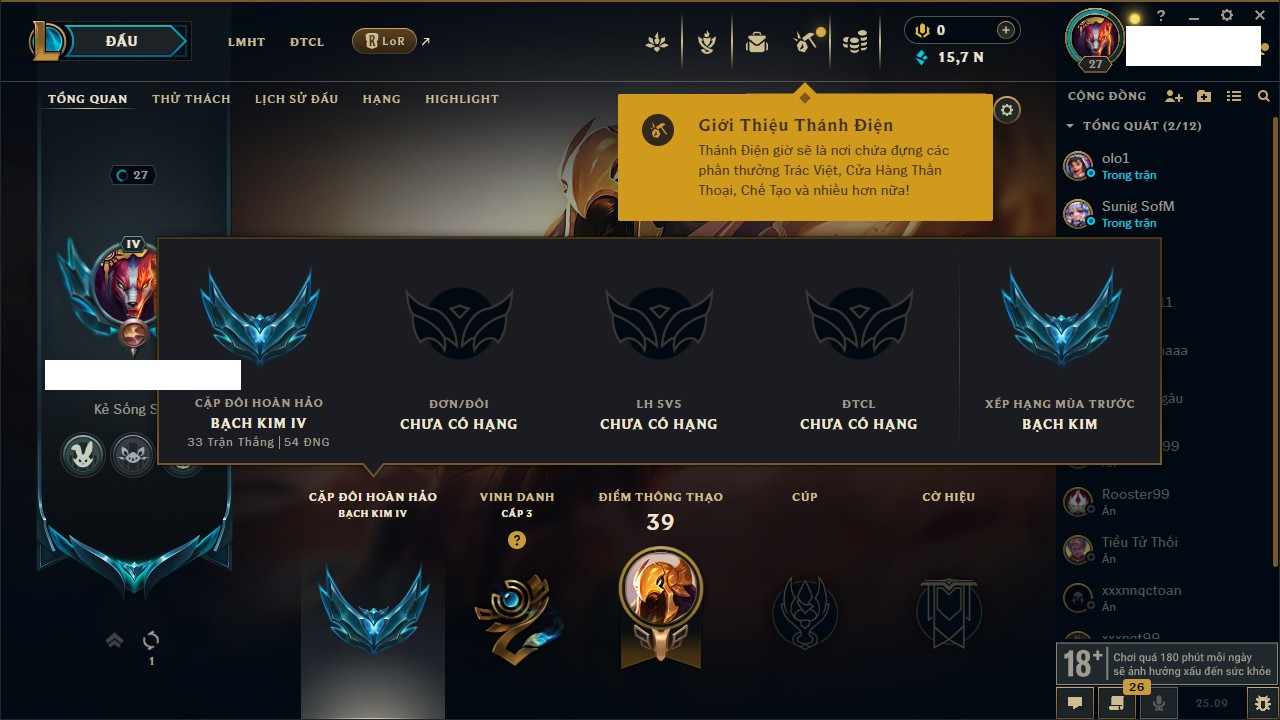 Rank Đơn: Vàng IIIKhung: BạcTướng: 171 - Còn 101359 THXTrang Phục: 88Rank ĐTCL: Kim Cương IVLinh Thú: 200