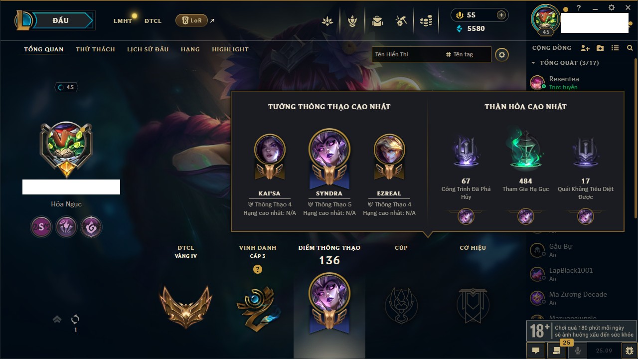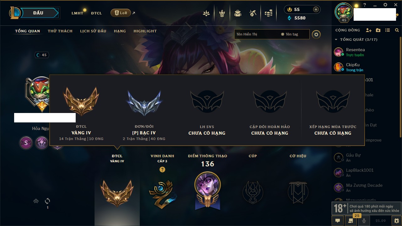 Rank Đơn: Vàng IKhung: BạcTướng: 171 - Còn 60584 THXTrang Phục: 286Rank ĐTCL: Vàng IIILinh Thú: 117