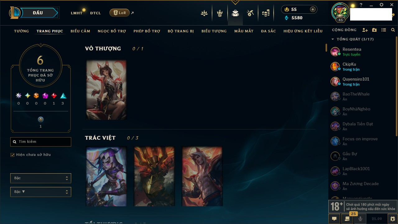 Rank Đơn: Vàng IIIKhung: VàngTướng: 171 - Còn 88128 THXTrang Phục: 329Rank ĐTCL: Chưa RankLinh Thú: 41