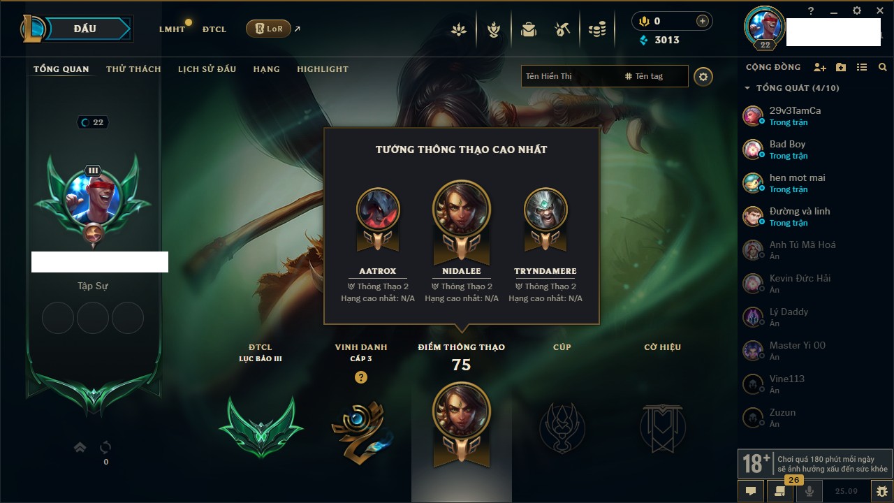 Rank Đơn: Chưa RankKhung: Chưa có khungTướng: 37 - Còn 27387 THXTrang Phục: 10Rank ĐTCL: Chưa RankLinh Thú: 1