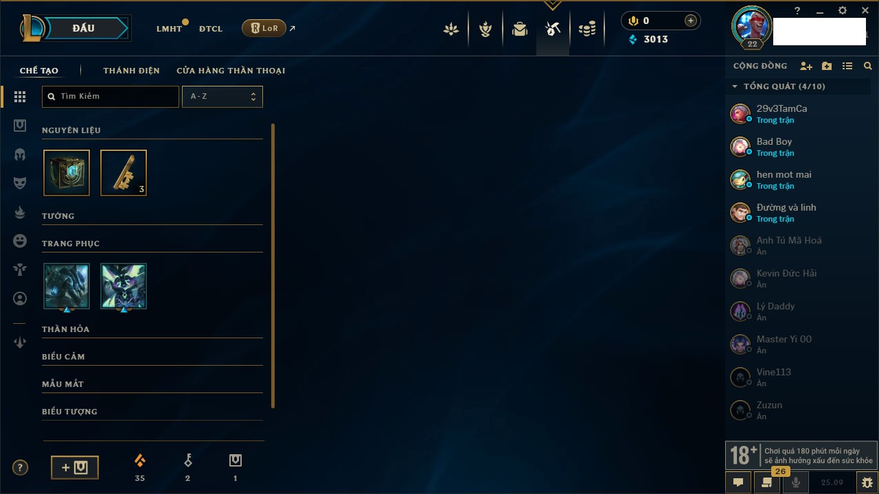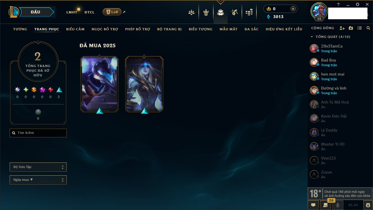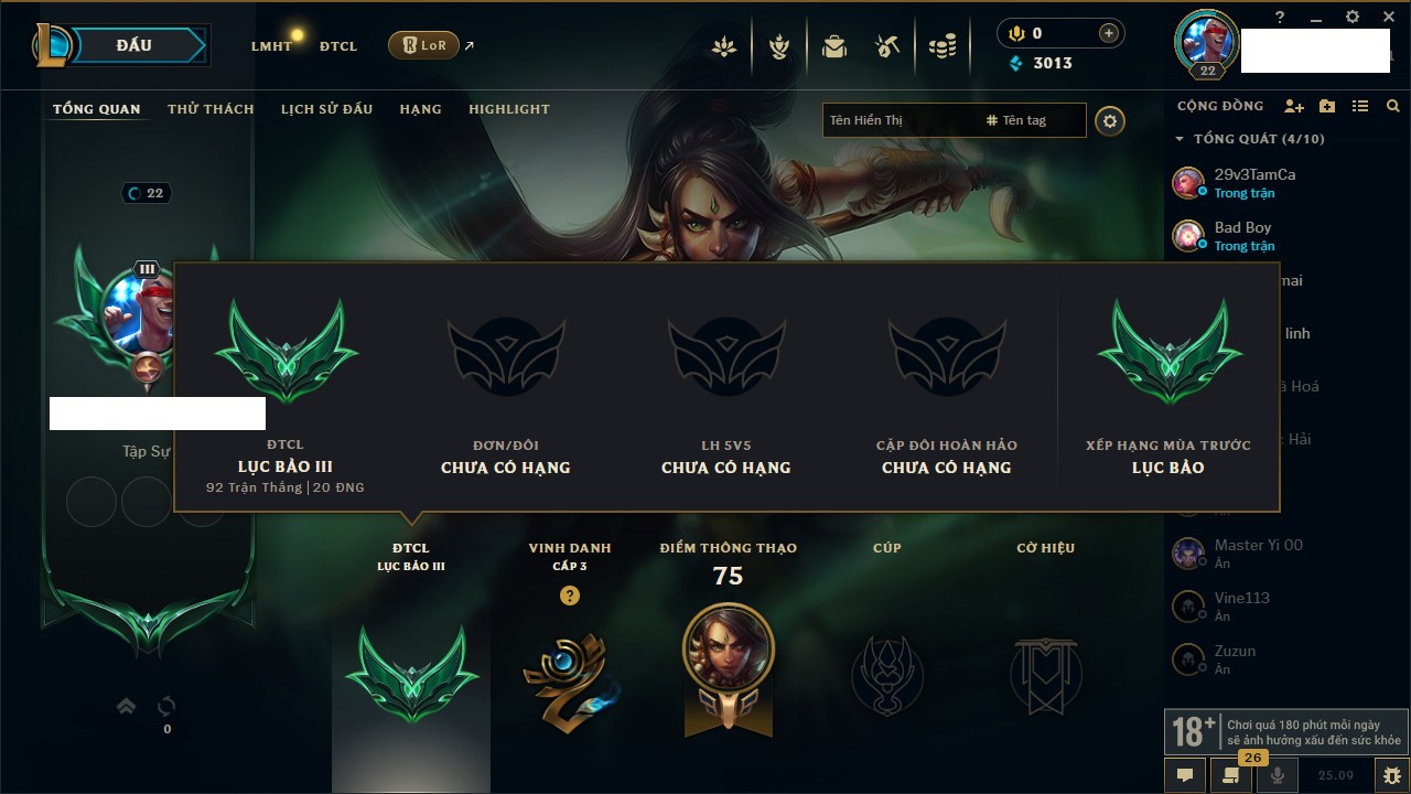 Rank Đơn: Chưa RankKhung: Chưa có khungTướng: 118 - Còn 13712 THXTrang Phục: 117Rank ĐTCL: Chưa RankLinh Thú: 34